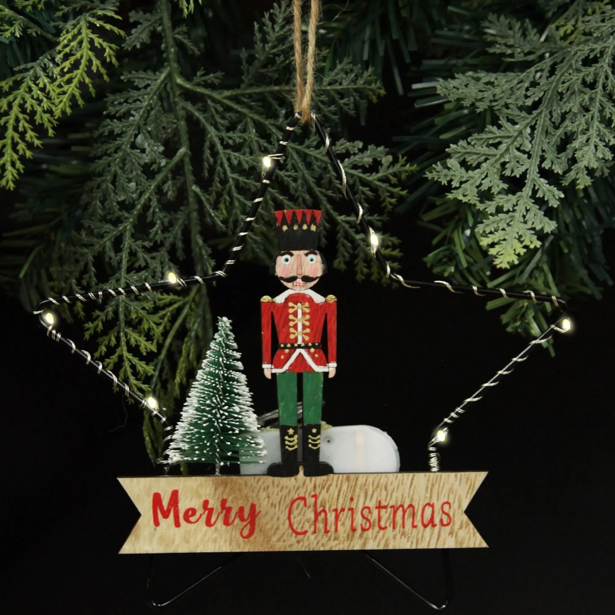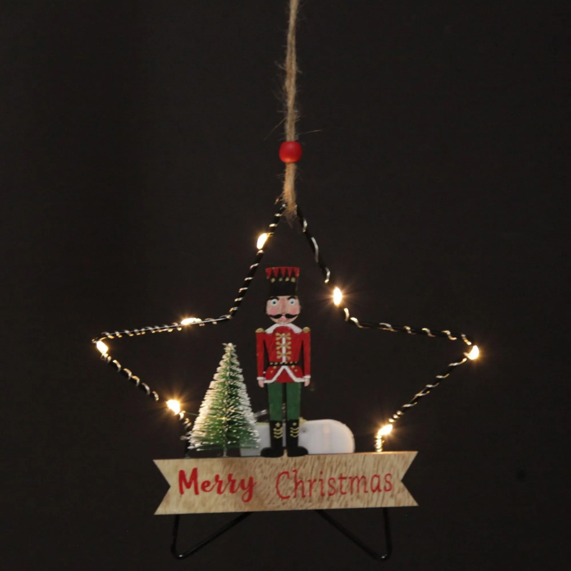 Add Traditional Christmas Charm To Your Tree With Our Lightup Wire Star Hanging Christmas Ornament With Nutcracker Guard. A Wire Star-Shaped Frame Is Adorned With A Wooden Cut-Out Of A Nutcracker Guard, A Merry Christmas Message, And A Small Wire Tree Embellishment. The Star Frame Features Wrapped Seed Lights That Illuminate The Ornament For An Exciting Display. Lights Are Battery Operated. Batteries Are Included.