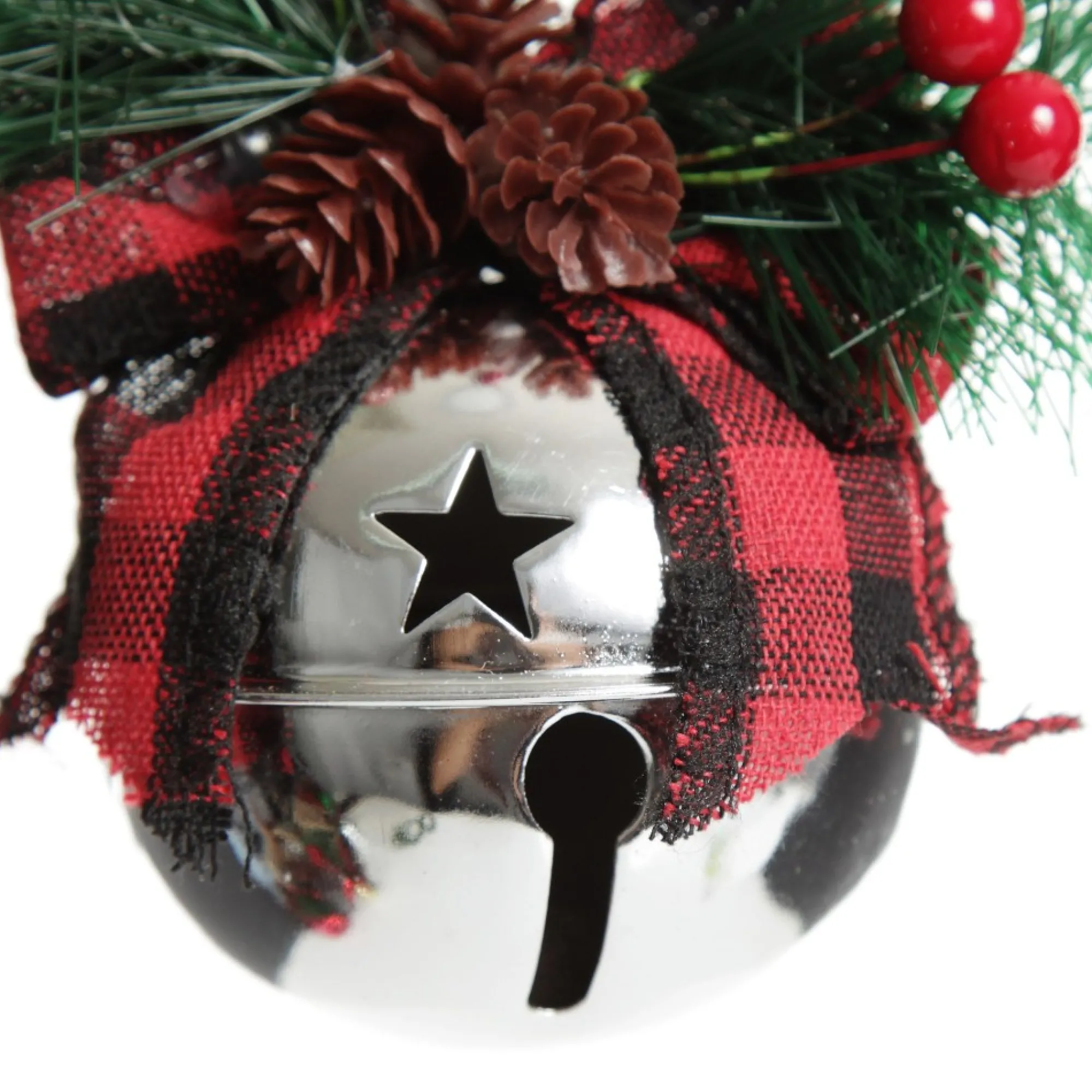 Crafted From Durable Materials, This Hanger Features A Silver Jingle Bell With Star Cut-Outs And An Embellishment Of Foliage, Red Berries, And A Lovely Red Buffalo Bow. A Twine Covered Hoop Sits Atop The Bell For Easy Placement.