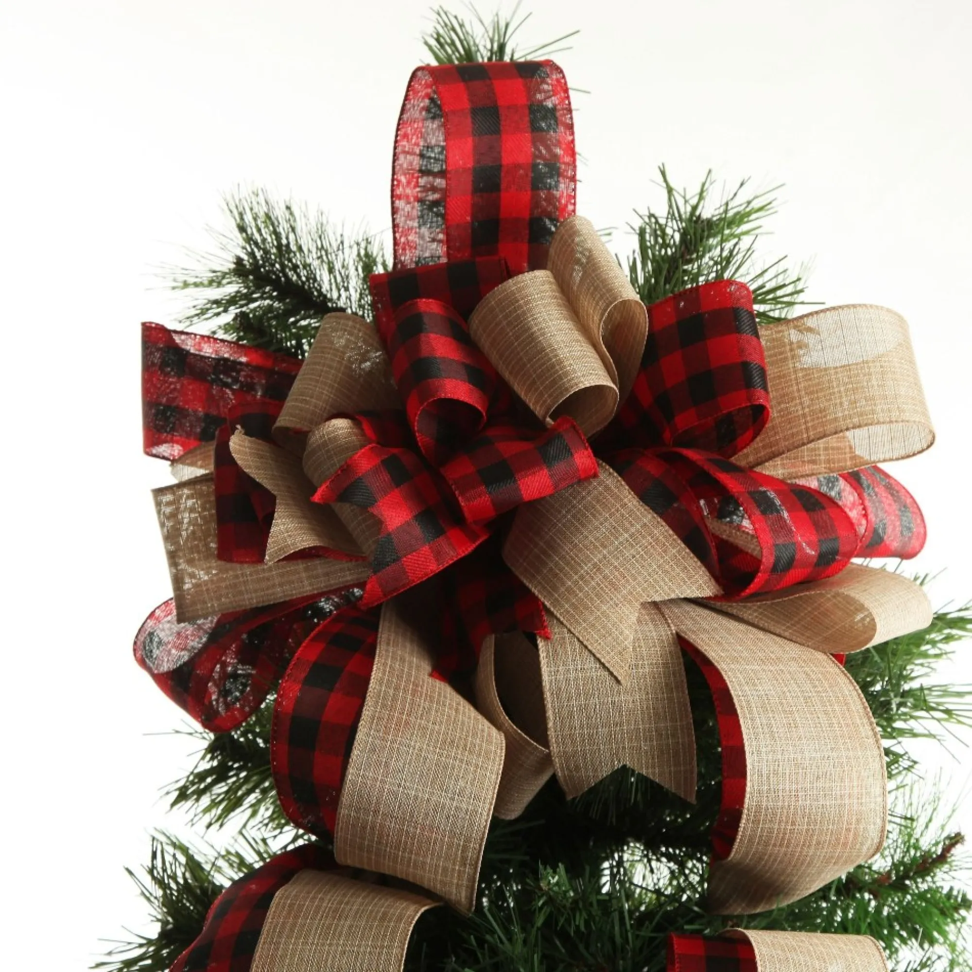Create An Extravagant Christmas Tree Display In Your Home With Our Buffalo Check Deluxe Tree Topper Bow With Streamers. This Utterly Unique Tree Topper Features An Assortment Of Red And Black Buffalo Check Ribbon And Natural Burlap Intricately Woven, Looped, And Arranged To Create A Magnificent Bow With Hanging Ribbon ‘streamers’ For Added Texture. You Can Use This Unique Bow To Embellish Your Christmas Tree As A Tree Topper, To Decorate A Large Custom Wreath, Or To Decorate Any Door, Wall, Or Window In Your Home.