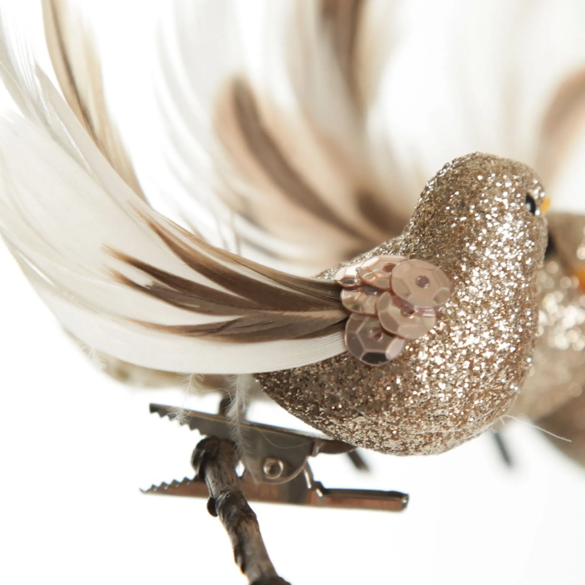 This Delightful Champagne Bird Clip With Feather Tail – Set Of 3 Will Add Something Unique To Your Festive Displays. Featuring 3 Stunning Champagne Birds With A Sparkling Glitter Finish And Soft Feather Tail. A Clip Is Affixed To The Birds Making It Easy To Place And Secure Wherever You Choose.