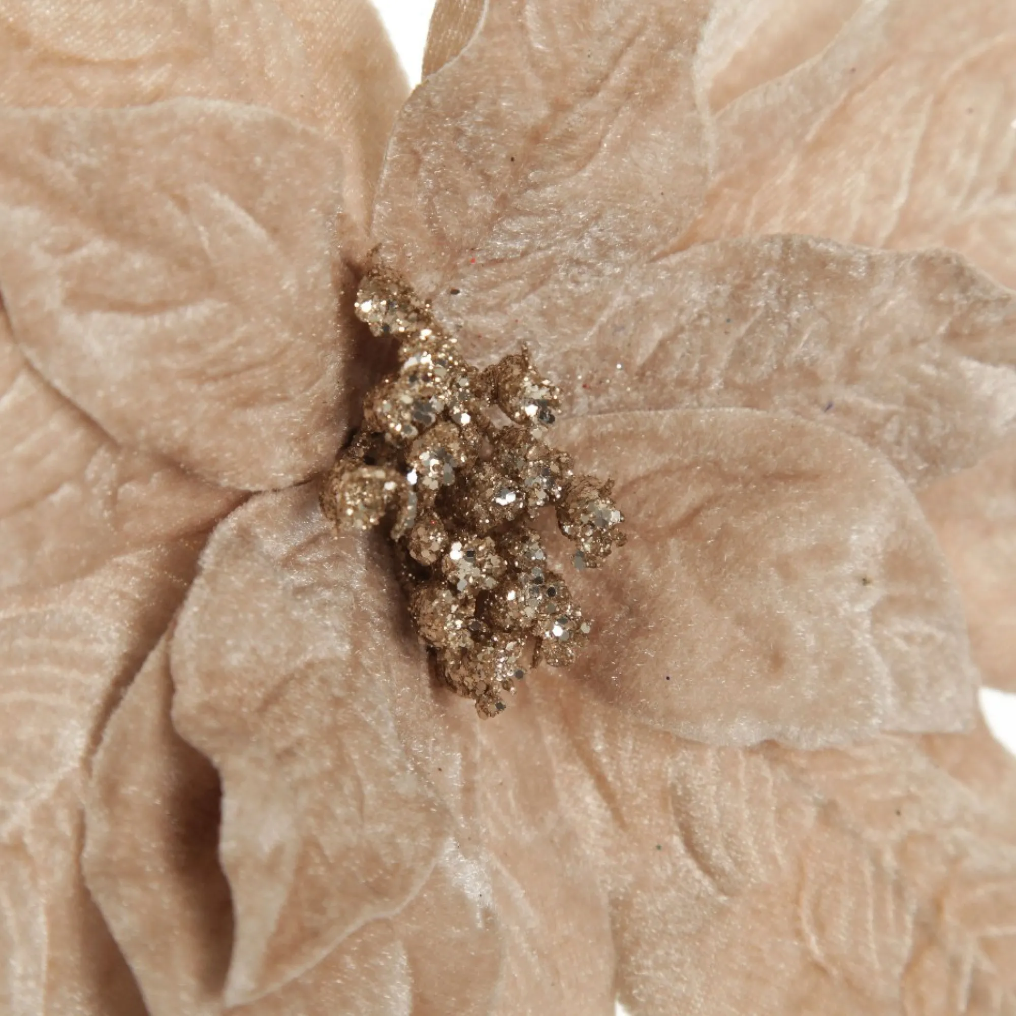 Add Elegance To Your Festive Displays With This Champagne Velvet Poinsettia Flower Stem. Featuring Lush, Layered Velvet Petals With Natural Textured Lines And Glitter Pollen Details. Extending From The Base Of The Flower Is A Durable And Flexible Stem, Making It Easy To Place And Arrange While Crafting And Decorating. Use The Flower To Embellish Your Christmas Tree, Garlands, Wreaths, And Floral Arrangements.