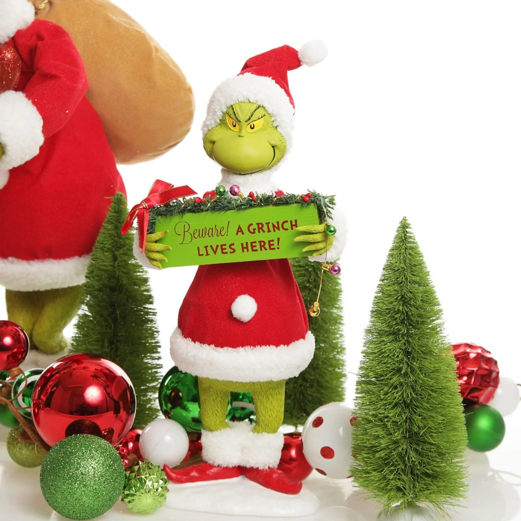 Add Something Unique To Your Festive Display With This D56 Possible Dreams – Beware! A Grinch Lives Here Christmas Ornament. Featuring Everyone’s Favourite Grinch Character Dressed In His Festive Attire With Fabric Trim And Holding A Sign That Reads ‘Beware! A Grinch Lives Here!’.