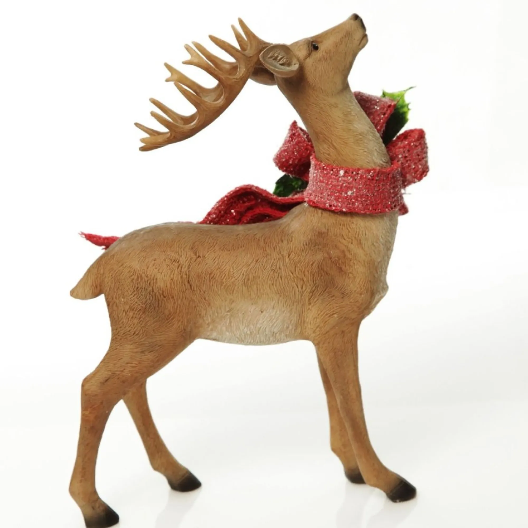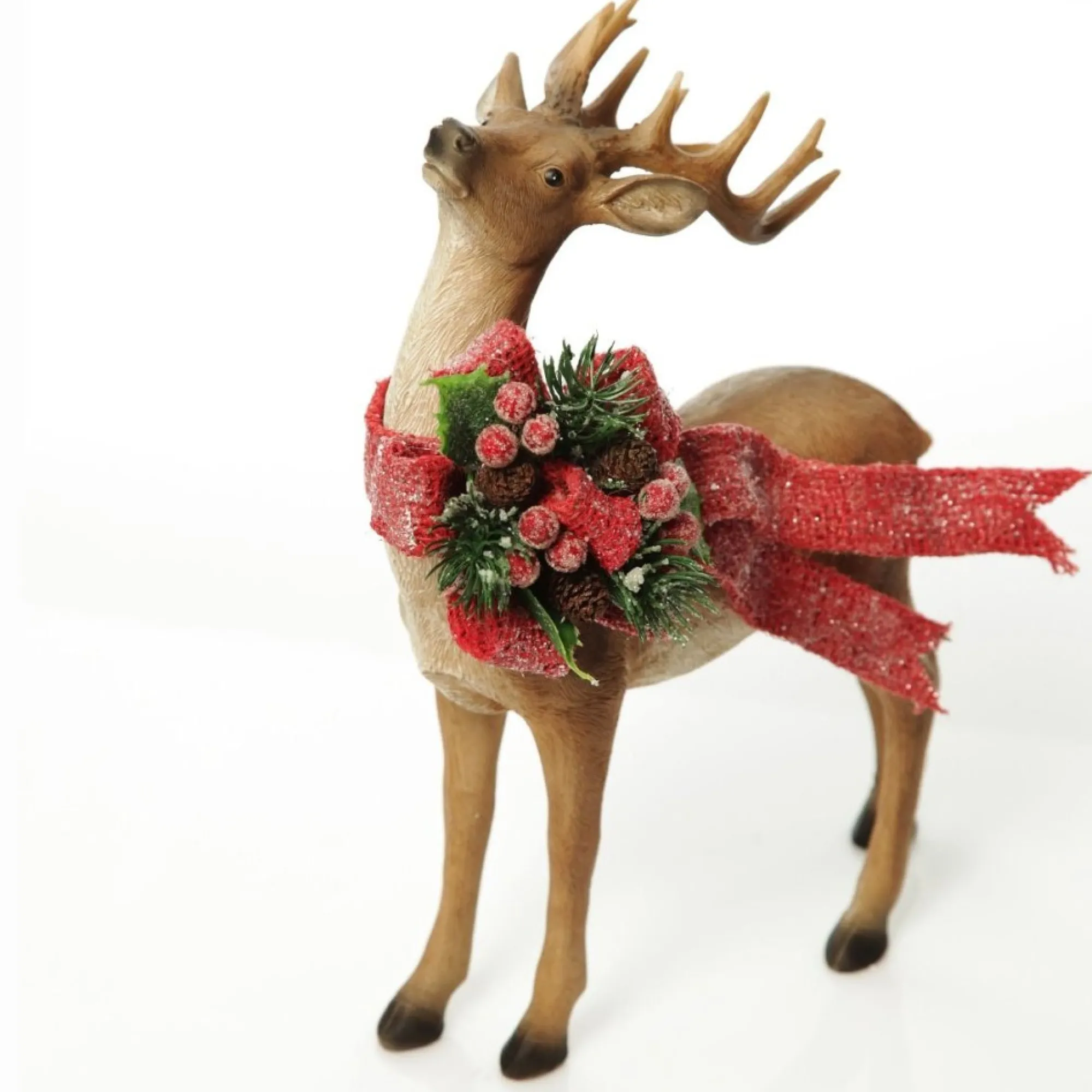 This Ornament Is Crafted From Durable Polyresin And Features A Classic Christmas Deer Decorated With A Flowing Red Bow Embellished With Acorns, Berries, And Green Leaves. The Deer Stands Proudly With All Four Feet On The Ground, And Head Tilted Up Towards The Sky.