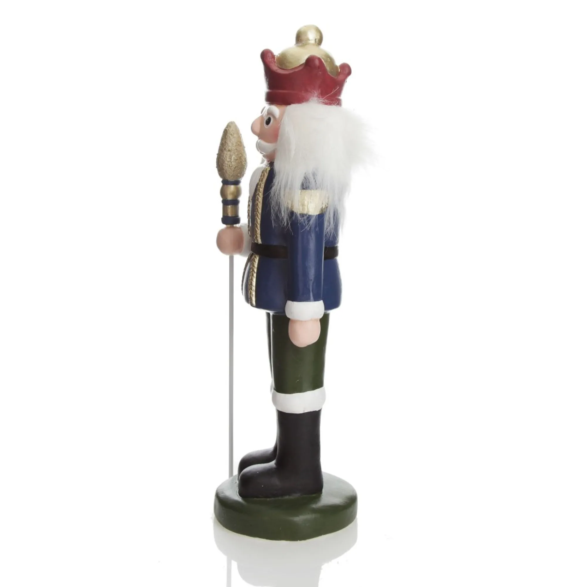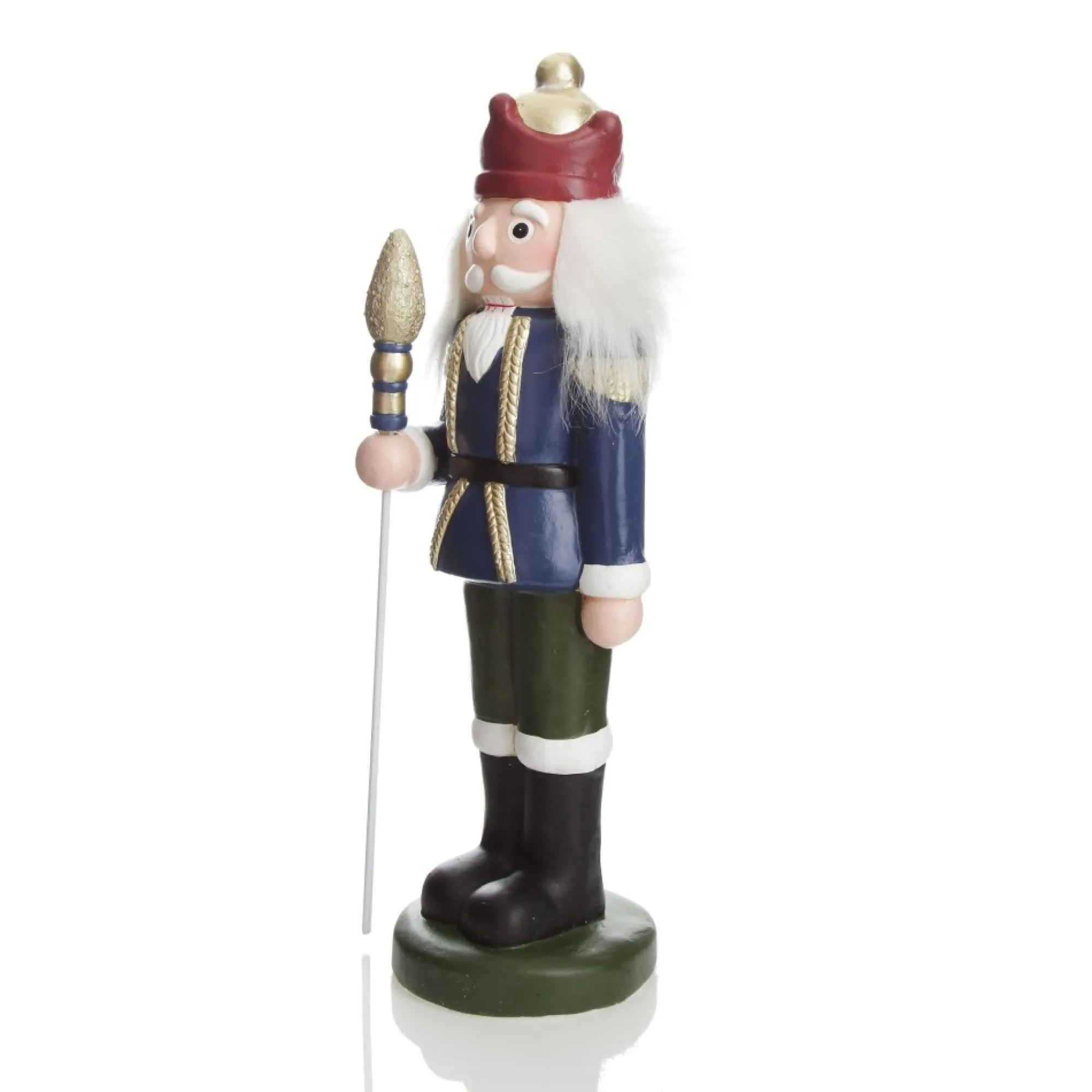 Shop Our Magical Large Blue Jacket Nutcracker Christmas Ornament. Featuring A Striking Painted Blue Military Jacket, A Red And Gold Crown, A Golden Glitter Staff And White Fluffy Hair. With A Circular Base, It Is Easy To Place This Nutcracker On Any Surface.