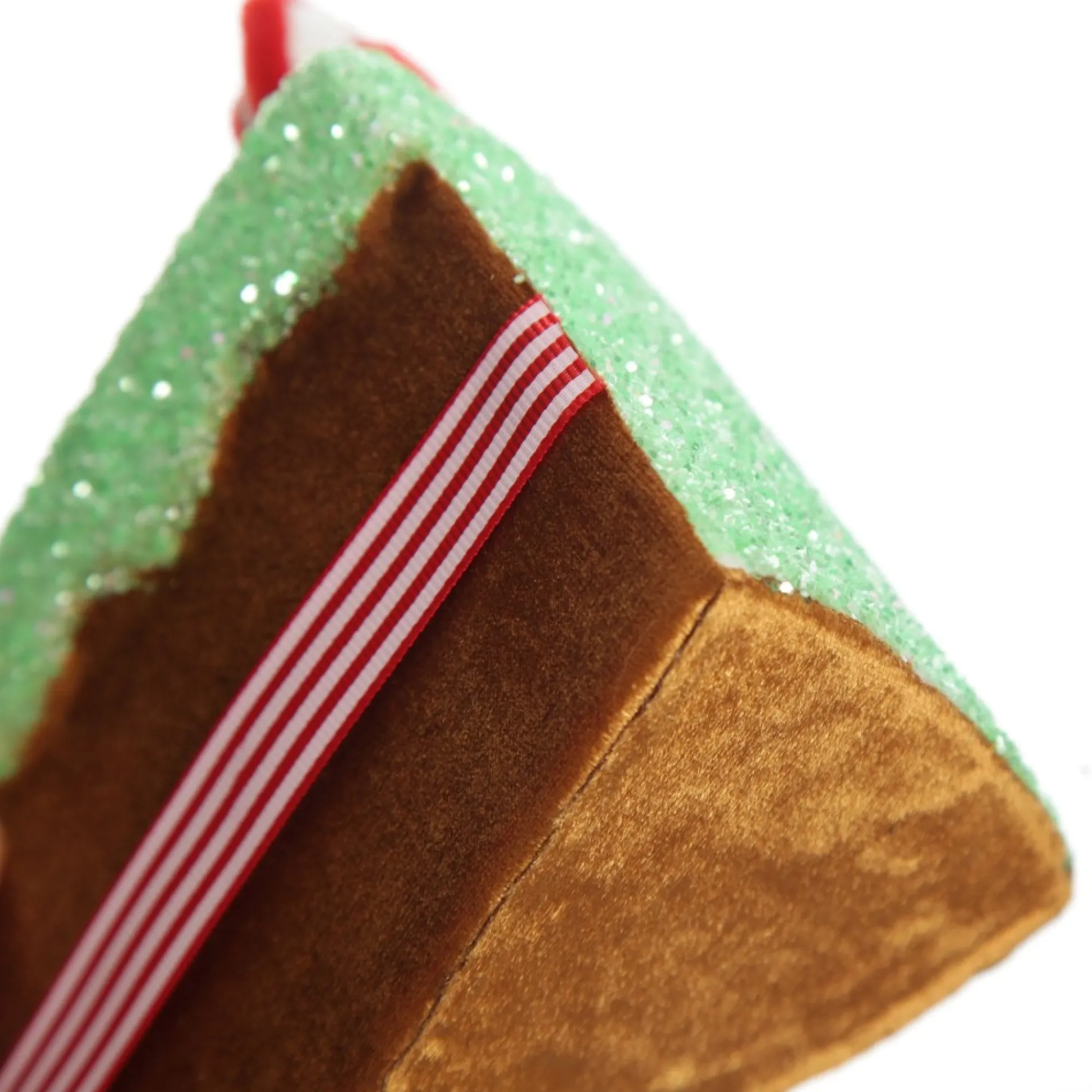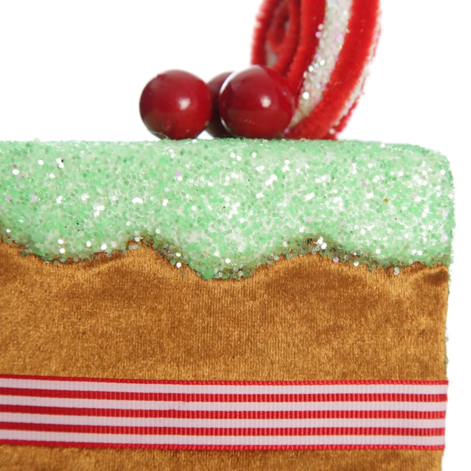Crafted From Lightweight Material With A Sleek Velvet Finish, This Gingerbread Cake Slice Decoration Features Sparkling Glitter Icing, Striped Ribbon Trim And Candy And Red Berry Embellishments. Complete With A String Attached For Easy Placement.