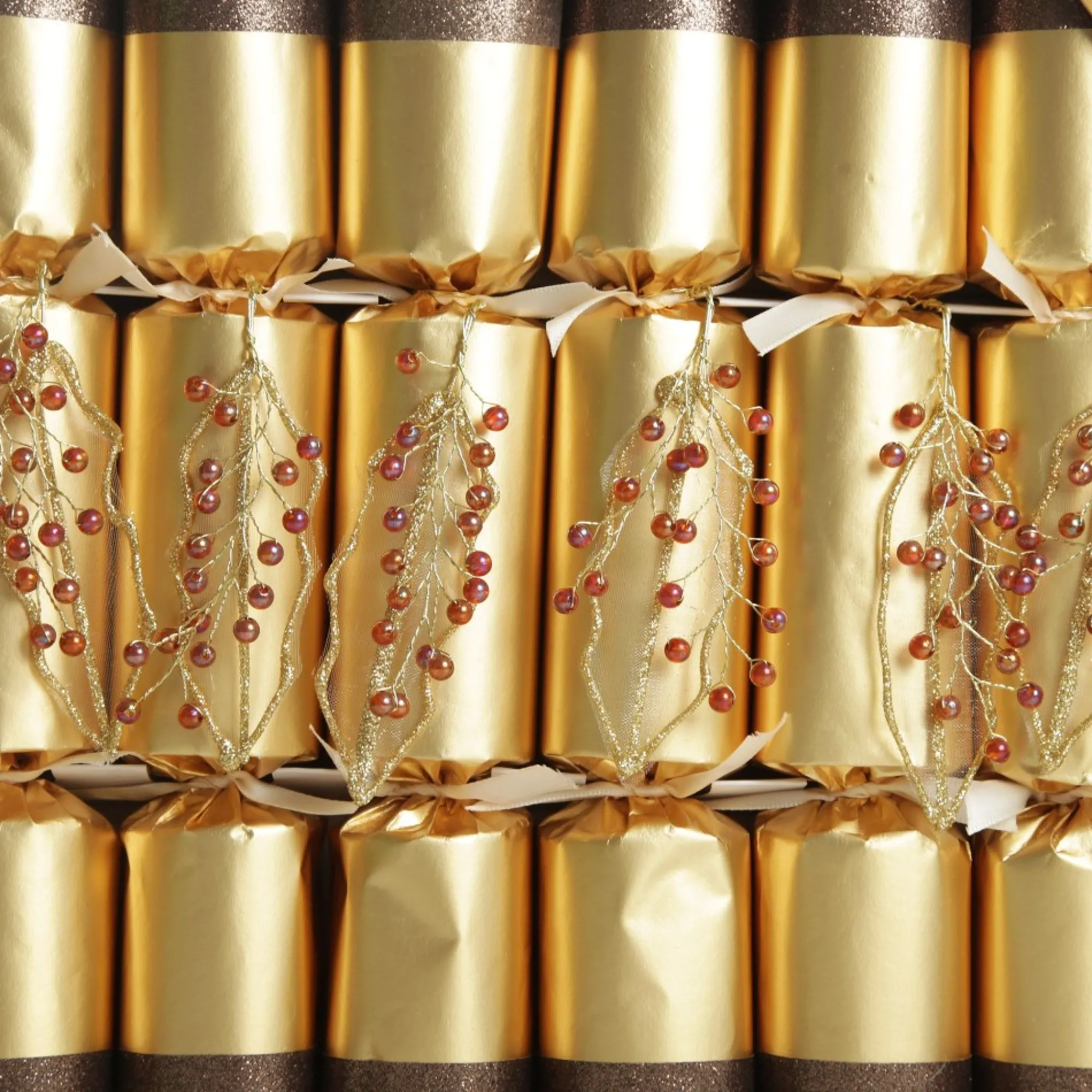 Keep Up Classic Christmas Traditions With These Gold Leaf Sparkle Christmas Bon Bons. The Set Contains 6 Bon Bons Featuring A Lush Gold Finish With Brown Glitter Trim And A Beaded Leaf Embellishment. Each Bon Bon Contains A Novelty Gift To Surprise Your Guests.