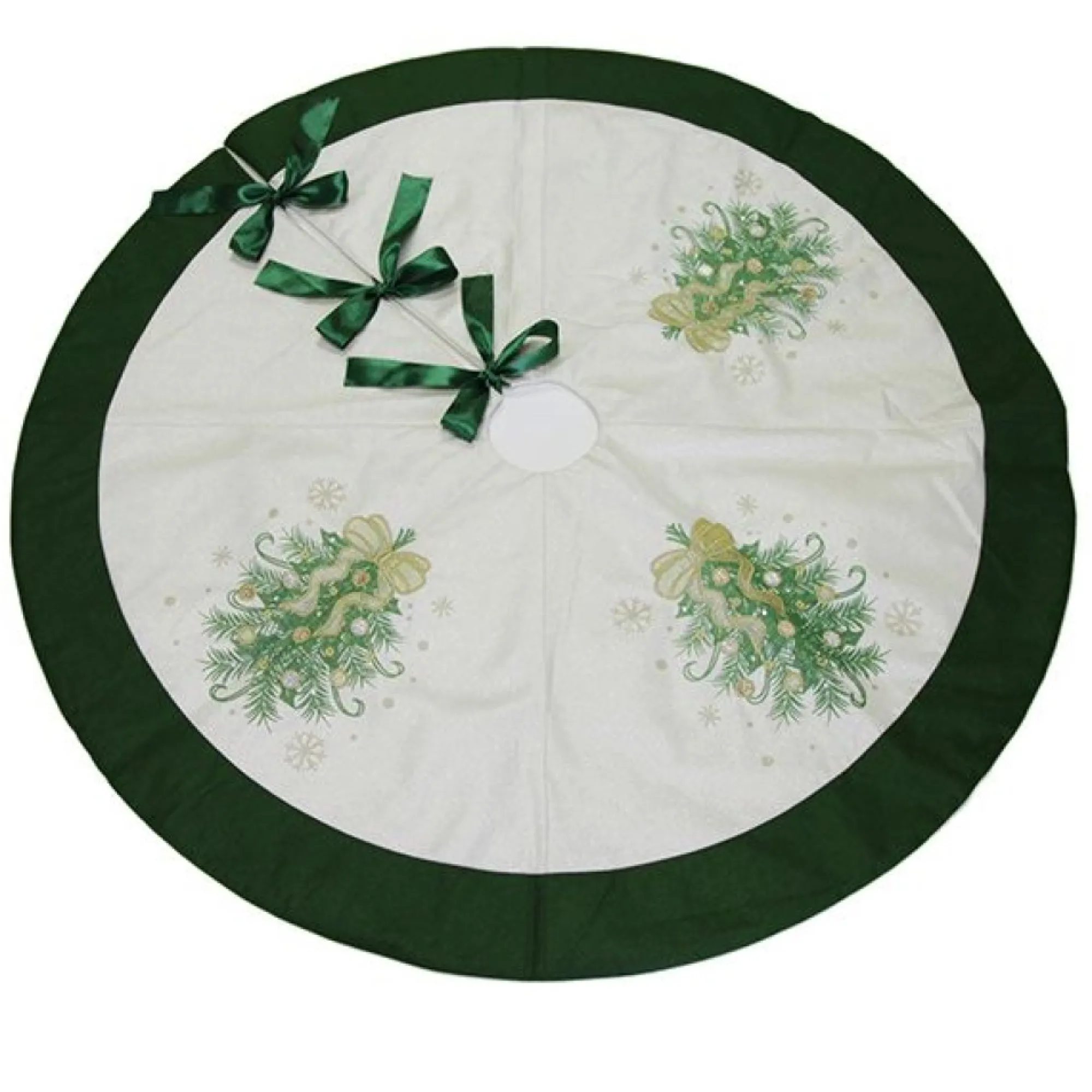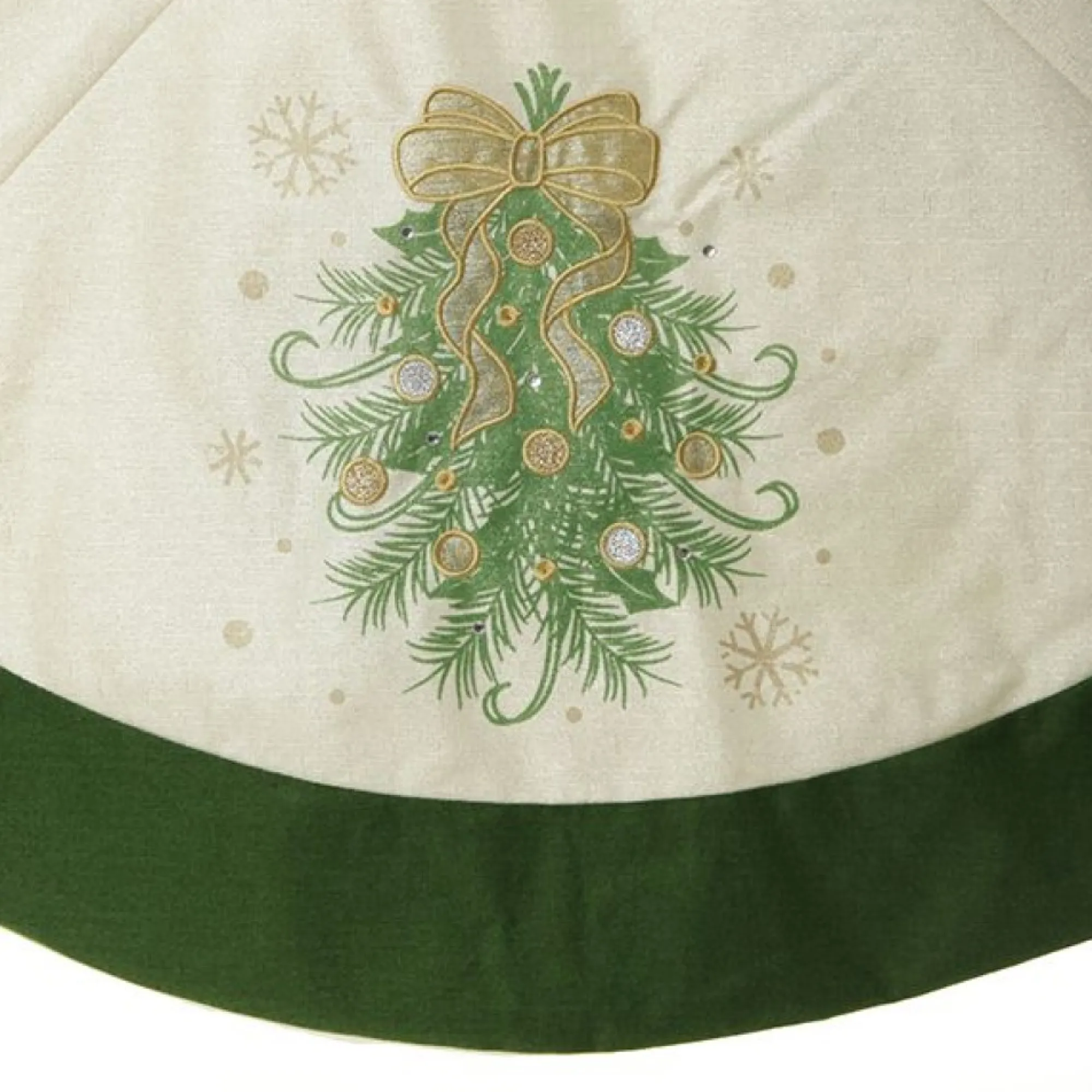 Complete Your Christmas Tree Display With This Delightful Traditional Green And Gold Mistletoe Christmas Tree Skirt. Crafted From A Soft And Durable Cotton Blend, This Tree Skirt Features Beautiful Appliqued Mistletoe Designs, Green Trim And Smooth Ribbon Details. Tree Skirt Is Fully Lined. Bring Out When Decorating For The Festive Season And Use To Dress The Bottom Of Your Christmas Tree. Use It To Hide The Base Of Your Tree And Keep It As A Staple Piece To Display Year After Year. Tree Skirts Complete Any Display And Create A Refined Look That Is A Great Setting For Presents. This Tree Skirt Is Perfect For A Traditional Christmas Theme Paired With Colour Palette Of White And Gold With Soft Green Christmas Florals. Create A Darling Display To Enjoy With The Whole Family This Festive Season With This Delightful Tree Skirt.