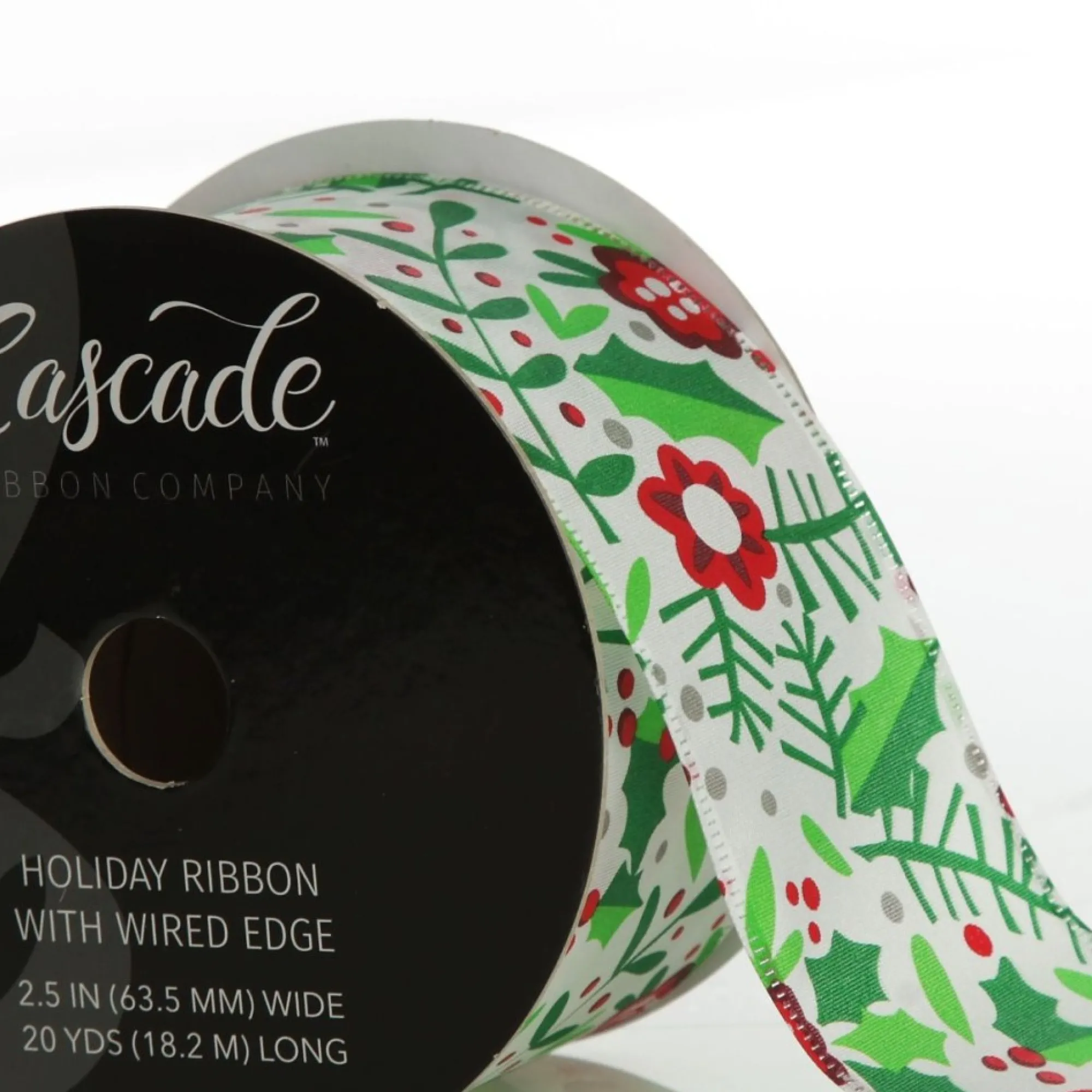 Made From Tightly Woven White Polyester With A Wired Edge, This Ribbon Features An Exciting And Bright Pattern With Gorgeous Red And Green Holly And Berry Flowers. The Wired Edge Makes It Perfect For Creating Beautiful Bows And Bellows That Hold Their Shape.