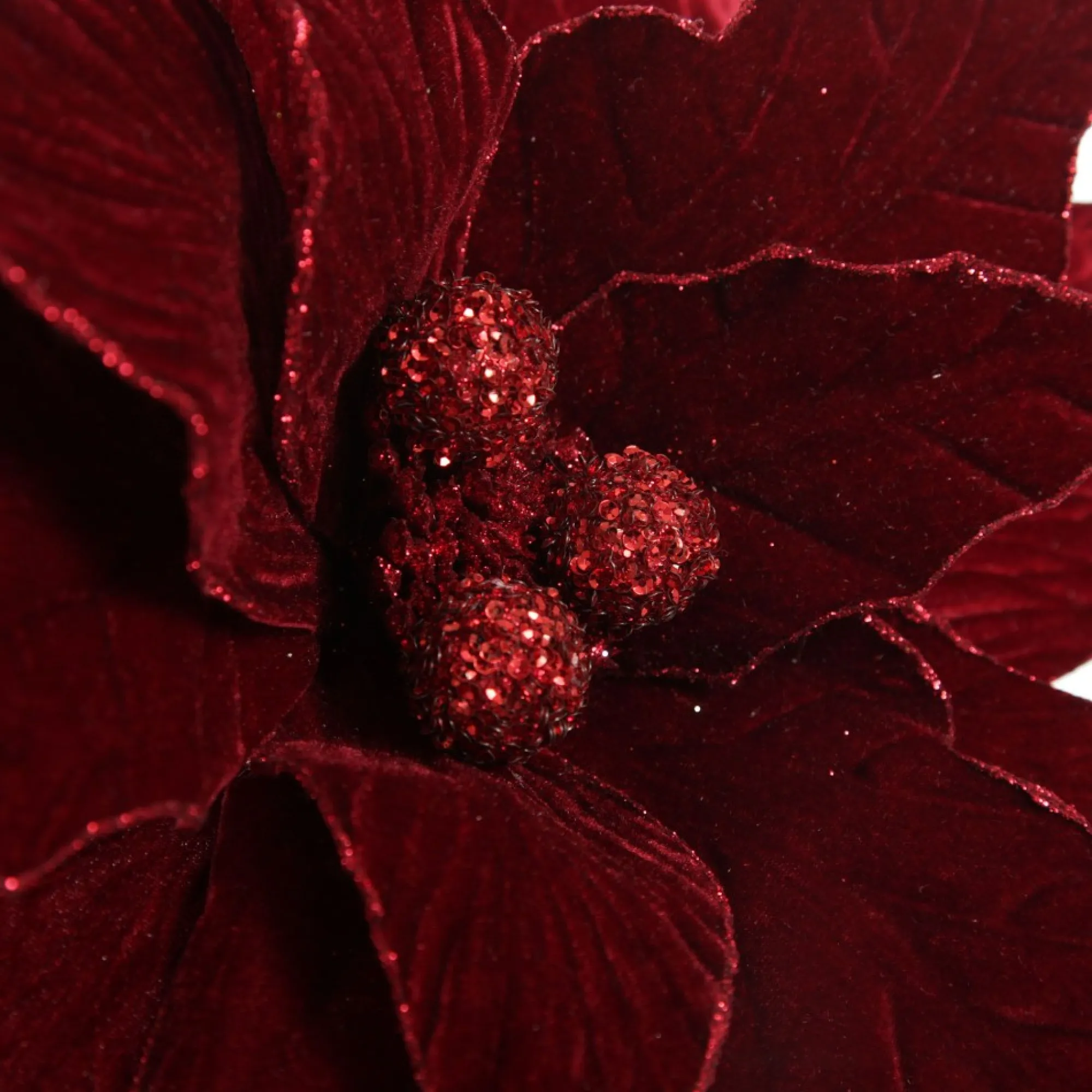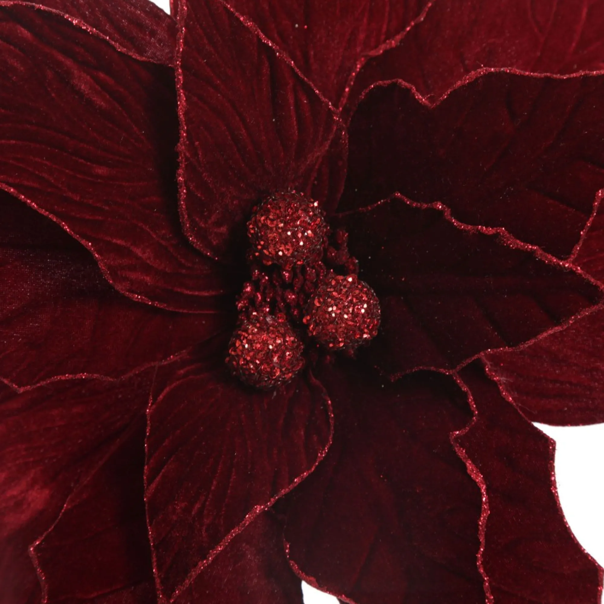 Crafted From Smooth Velvet-Like Material In A Luscious Burgundy Tone, This Faux Flower Features A Collection Of Layered Petals Of Different Sizes With Intricate Textures, Glitter Trim And A Delightful Sequin Embellishment In The Centre. Extending From The Base Of The Flower Is A Long Flexible Stem And Each Petal Is Wired Allowing For Easy Arrangements Which Hold Their Shape. Faux Flowers Are The Perfect Choice For Decorating Your Home This Festive Season. Simple And Elegant, These Flowers Are Sure To Enhance Any Christmas Display In Your Home.