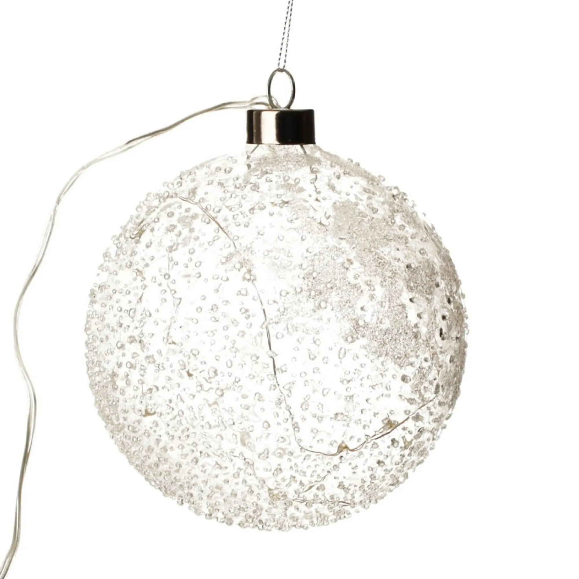 Light Up Your Tree Or Hang From Shelves Or Ceiling With This Clear Glass Bauble With Bubble Glitter Finish. Measures 12Cm. Uses 2 Aaa Batteries (Not Included).