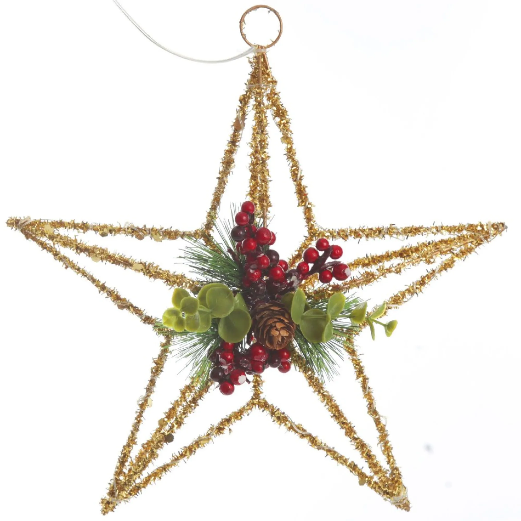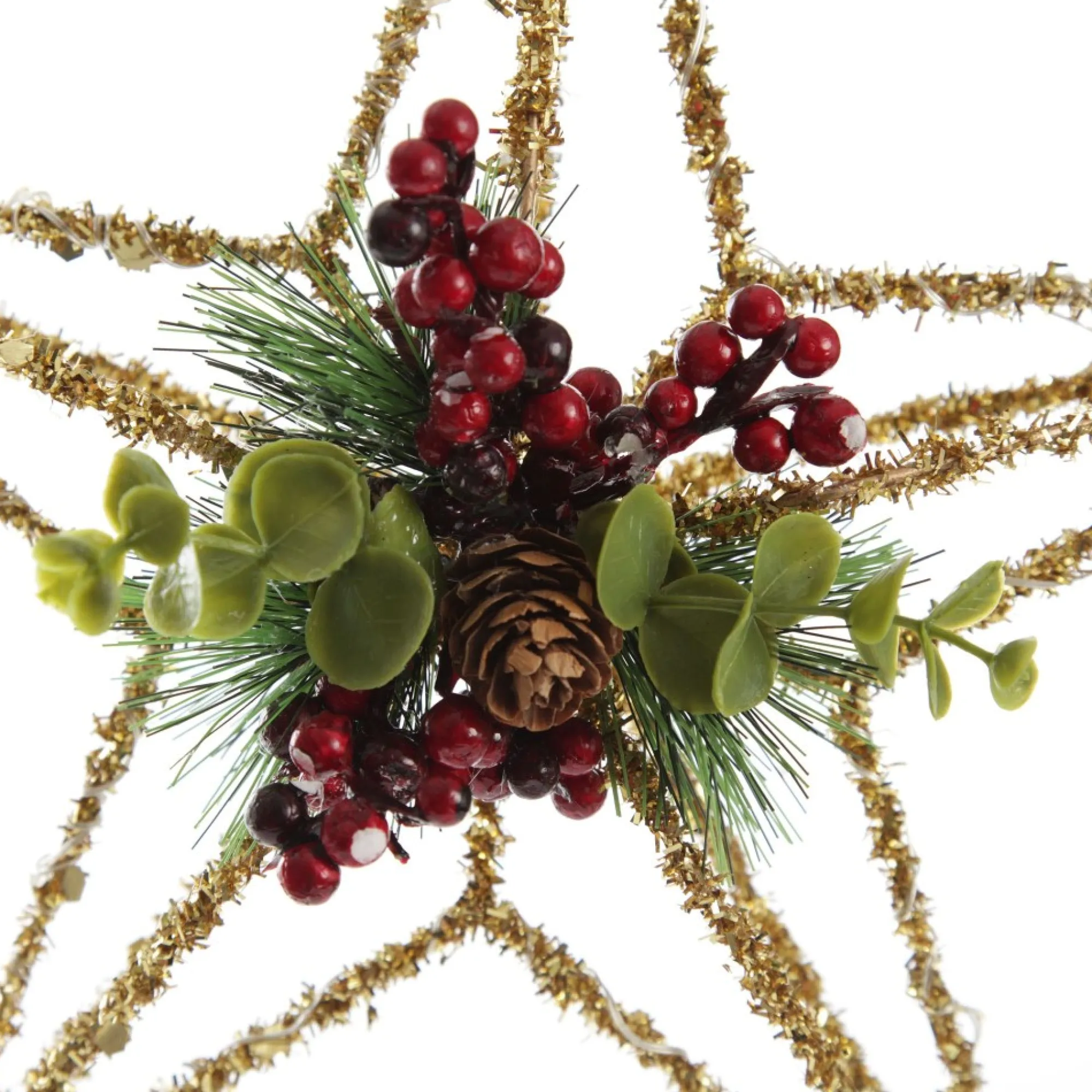 Create A Dazzling Christmas Display With Our Lightup Gold Tinsel Wire 3D Star Tree Topper With Cone And Berry. Crafted With A Durable Wire Base, This Tree Topper Features A Geometric Star Design Embellished With Vibrant Gold Tinsel, Green Foliage, Red Berries, And Pinecones. The Star Is Illuminated By Battery-Operated Seed Lights For An Extra Magical Effect.