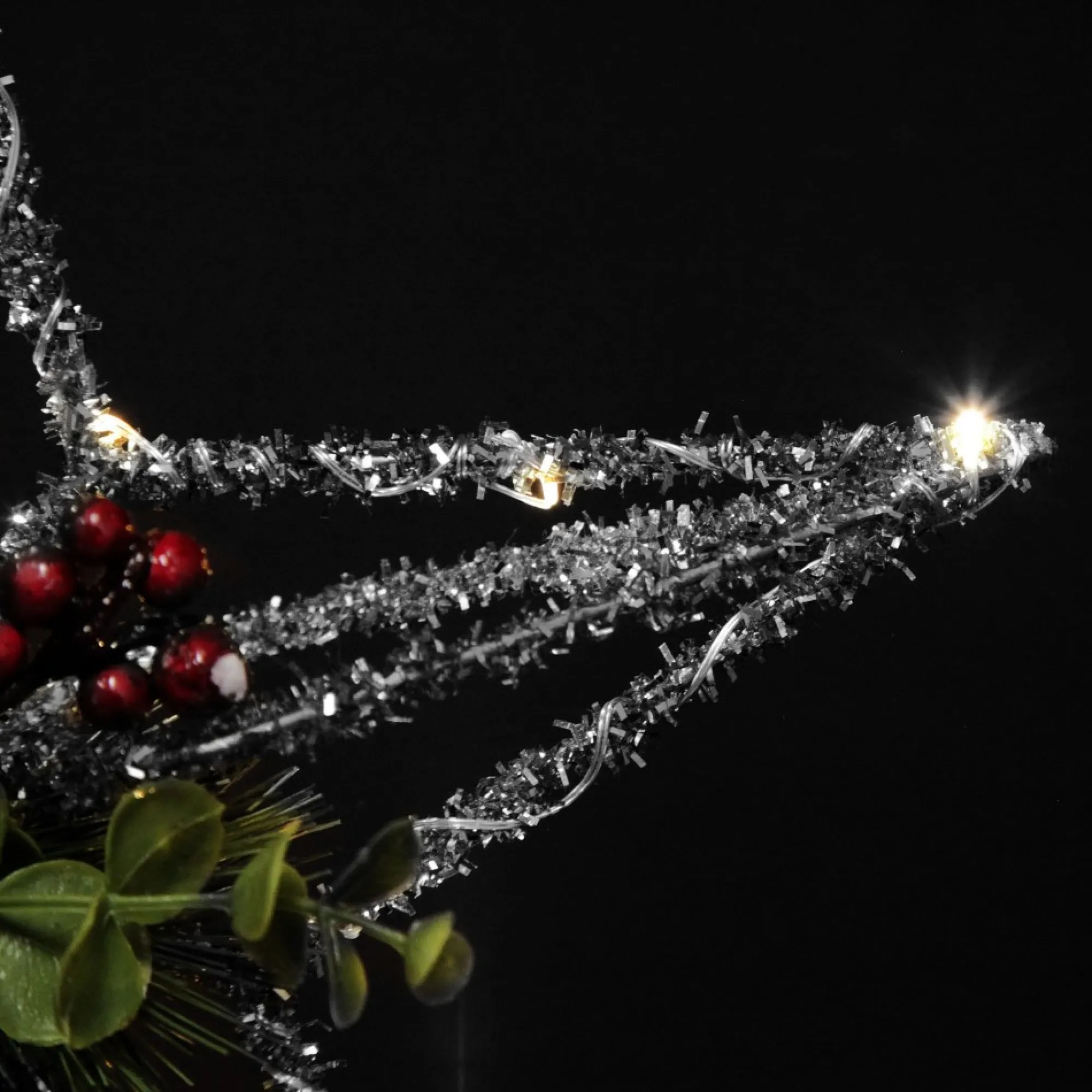 Illuminate Your Christmas Tree Display With Our Lightup Silver Tinsel Wire 3D Star Tree Topper With Cone And Berry. Crafted With A Durable Wire Base, This Tree Topper Features A Star Design With Sleek And Sparkling Silver Tinsel, Green Foliage, Red Berries, And A Pinecone In The Centre. Seed Lights Illuminate The Tree Topper For An Extra Magical Effect.