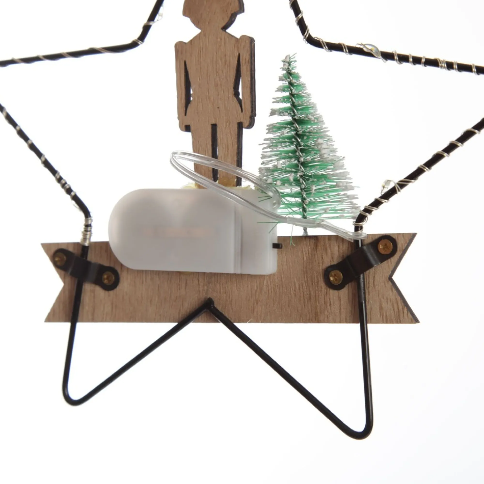 Add Traditional Christmas Charm To Your Tree With Our Lightup Wire Star Hanging Christmas Ornament With Nutcracker Guard. A Wire Star-Shaped Frame Is Adorned With A Wooden Cut-Out Of A Nutcracker Guard, A Merry Christmas Message, And A Small Wire Tree Embellishment. The Star Frame Features Wrapped Seed Lights That Illuminate The Ornament For An Exciting Display. Lights Are Battery Operated. Batteries Are Included.