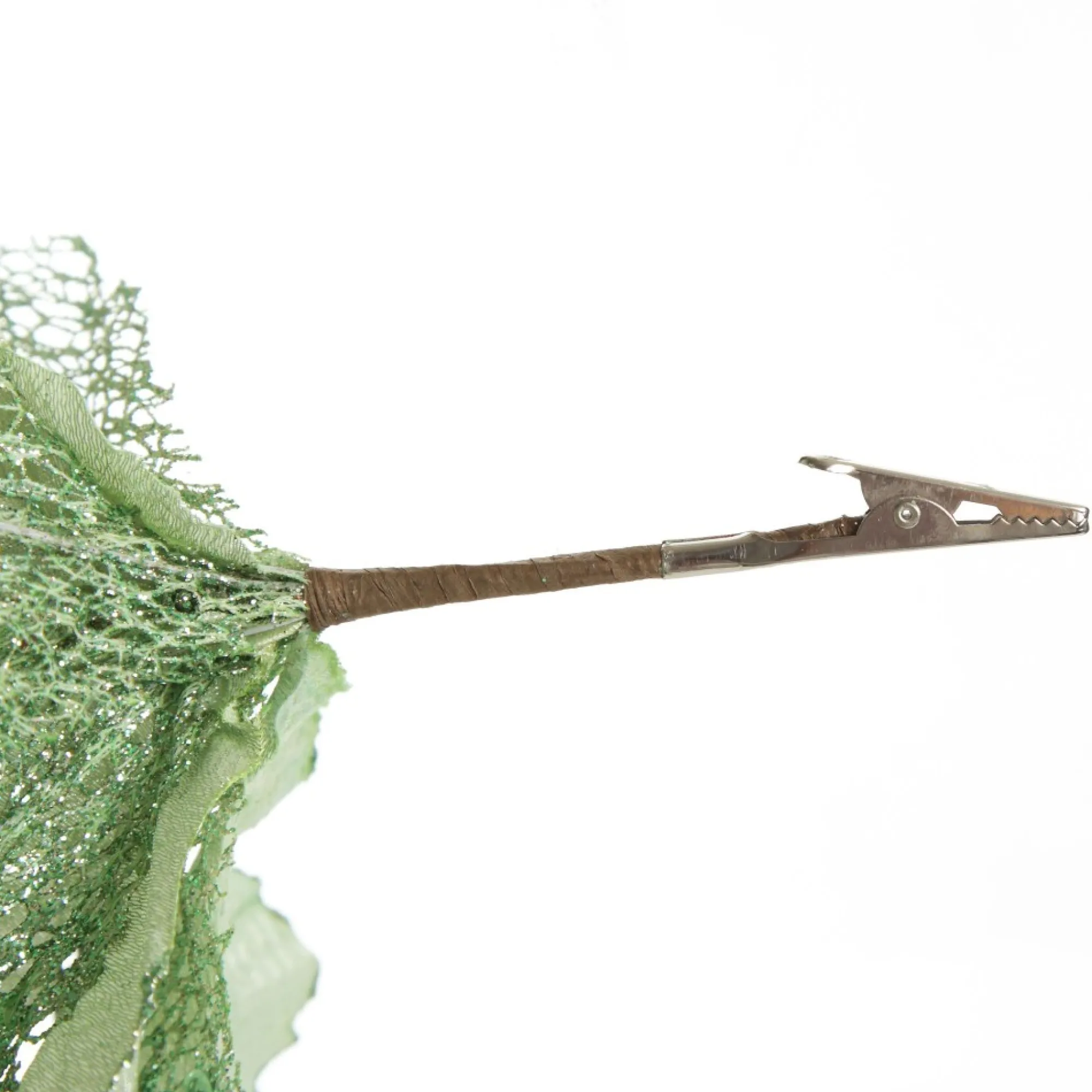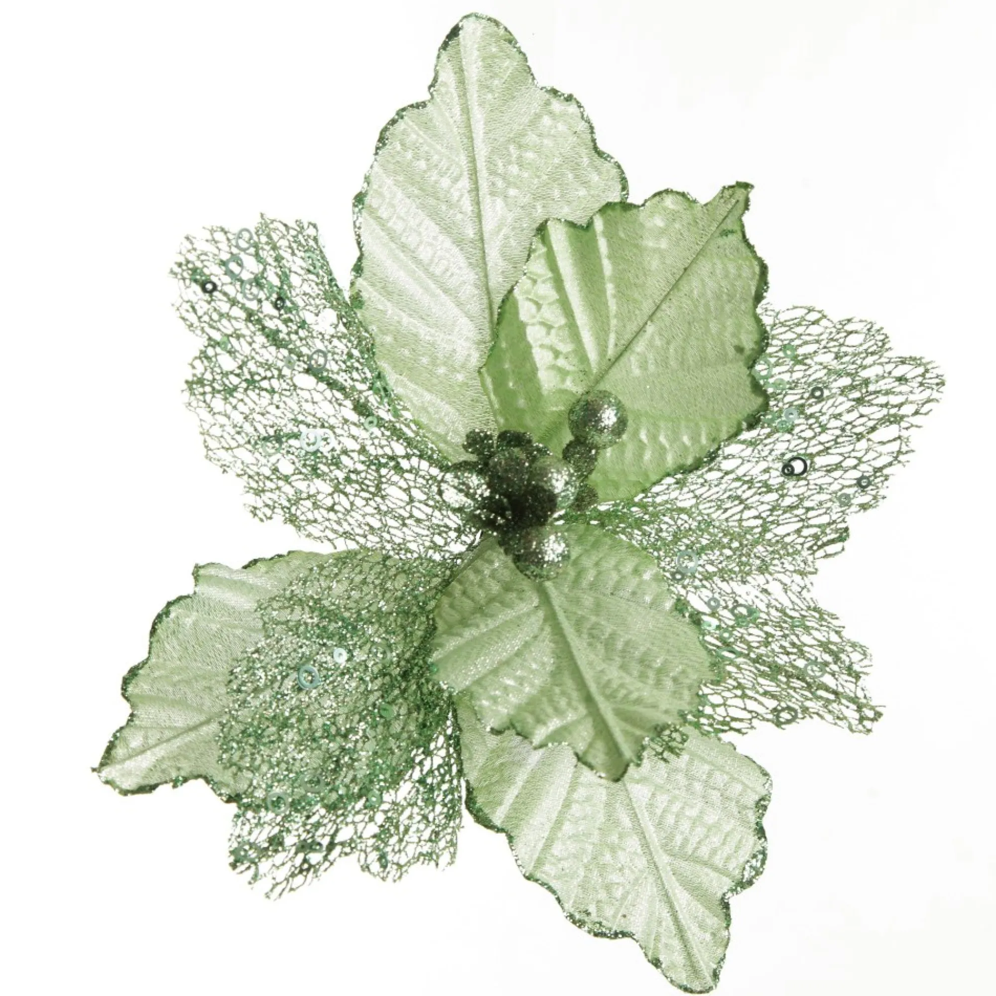 This Unique Mesh And Shiny Mint Poinsettia Flower Clip Will Make The Perfect Addition To Your Festive Floral Displays! Crafted With A Mix Of Mesh And Shiny Mint-Coloured Petals With Textured Details And Glitter Elements. The Flower Has A Short, Flexible Stem And Clip Attached For Easy Placement. Use To Embellish Your Christmas Tree, Floral Arrangements, Garland Displays, Wreaths And More!