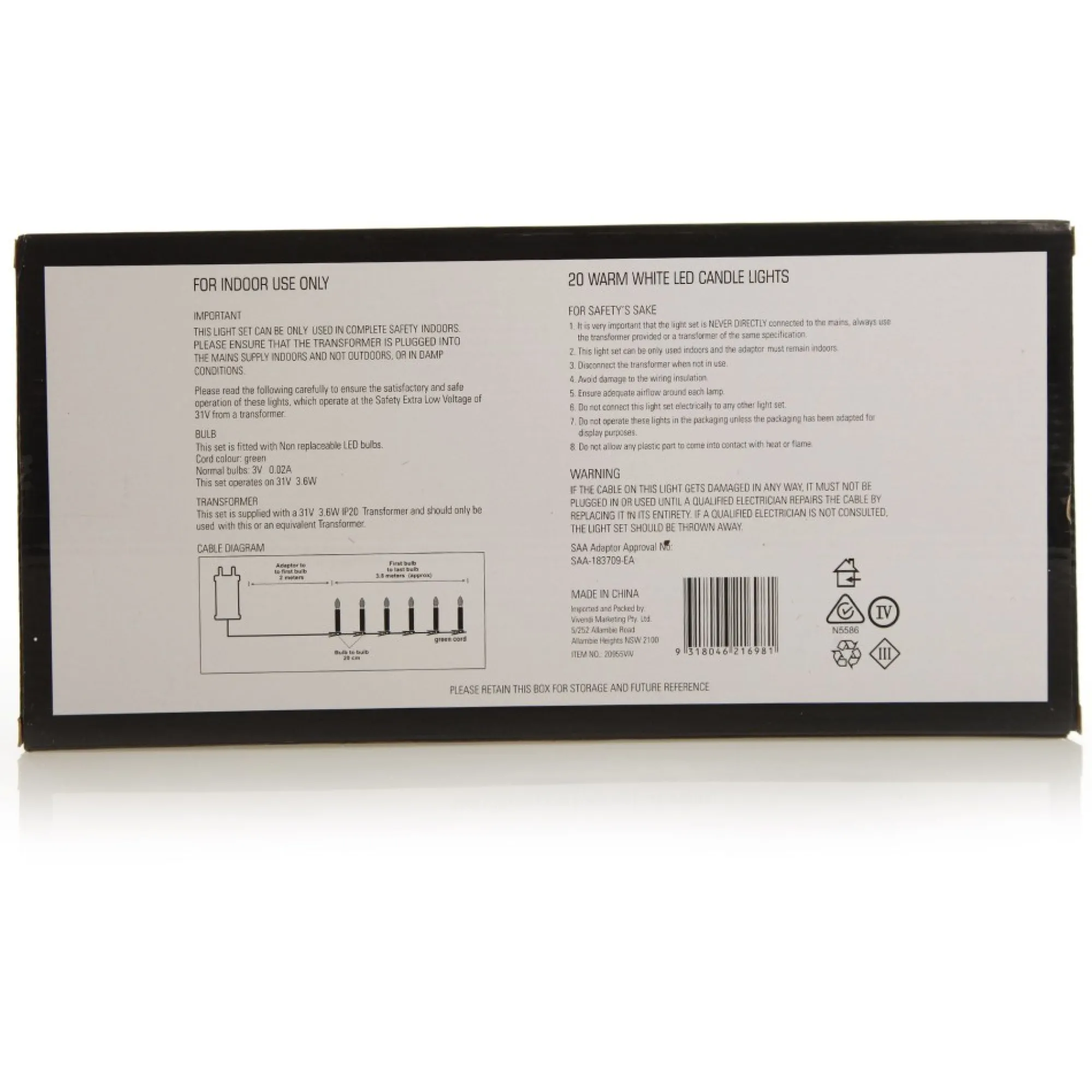 Featuring A Collection Of 20 Stunning Warm White Led Lights With Ivory Coloured Casing With Candle Wax ‘Drips’. Each Candle Light Has A Clip On The Base Making It Easy To Affix The Light To The Branches Of Your Tree. The Perfect Way To Finish Off Your Tree Display And Illuminate Your Beautiful Decorations.
