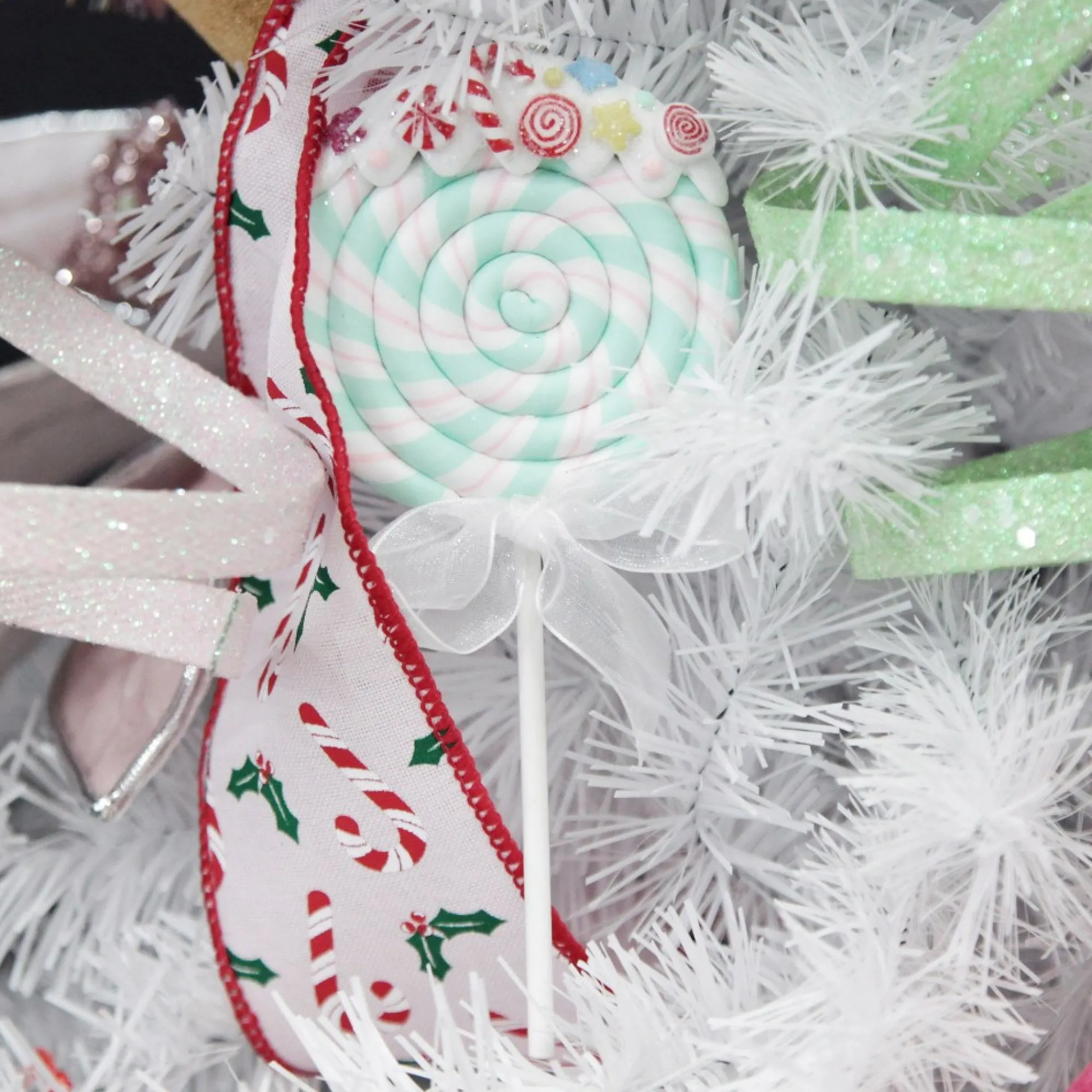 Sugar-Coat Your Christmas Display With This Mint Candy Swirl Lollipop Christmas Tree Decoration. Featuring A Mint, White, And Pink Swirl Lollipop Crafted From Durable Polymer Clay, With Glitter Frosting, And Candy Embellishments On Top. A White Organza Ribbon Bow Adorns The Stick And A Ribbon Hangs From The Top Of The Decoration For Easy Placement On Your Tree. This Lollipop Would Make Such A Sweet And Exciting Addition To Your Christmas Tree, Garlands, Wreaths And More. You Could Also Use It For A Unique Gift Topper Or Table Place Setting Embellishment For Your Christmas Day Feast. Perfect For A Peppermint Candy Christmas Decor Theme Paired With Vibrant Red, Green, White, And Silver Tones, Adorable Candy-Themed Decor And Glitter Galore!