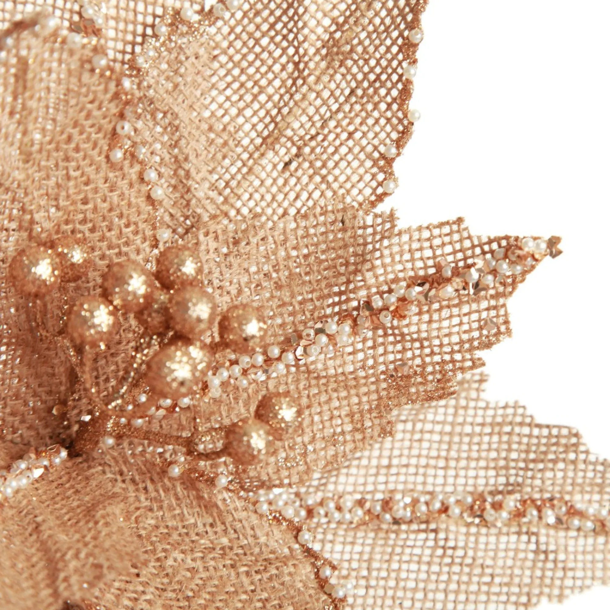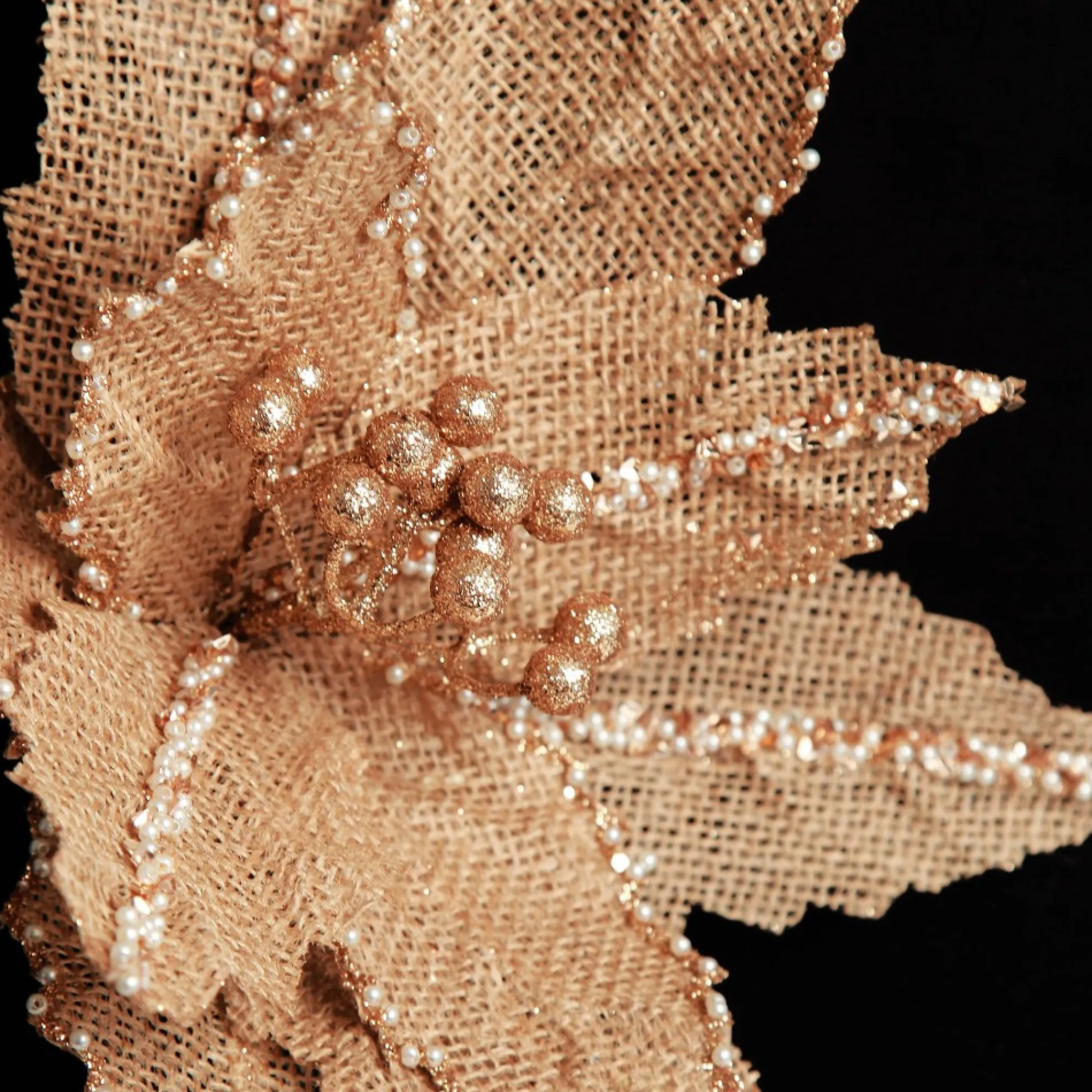 This Natural Burlap Poinsettia Flower Clip With Beads Is Perfect For Anyone Who Loves Decorating To Celebrate The Festive Season And Is Passionate About Christmas Styling. Immerse Yourself In This Rich And Earthy Hues Of Nature’s Palette, That Will Help Make Your Home Feel Warm, Cosy And Inviting. Shop Now And Get Your Natural Burlap Poinsettia Flower Clip With Beads Shipped From Australia By The Christmas Cart.