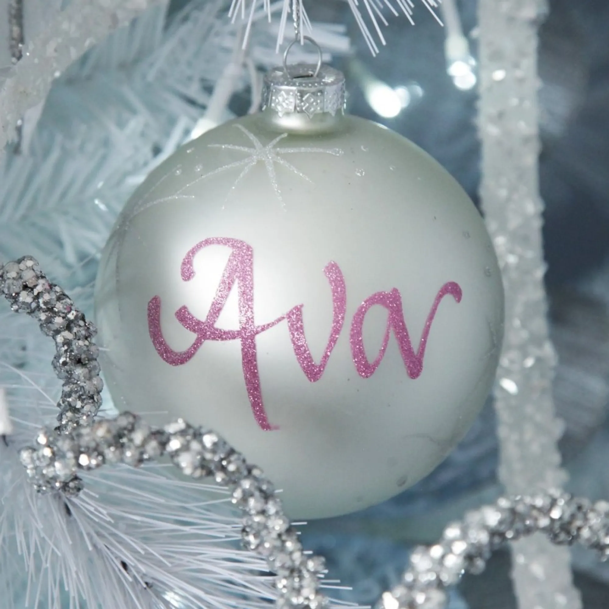 Add Radiance To Your Home With This Pearl Glass Personalised Christmas Bauble. Seamless, High Quality Glass Creates A Smooth Matt Pearl Finish, And The Silver Top And Metallic Thread Means This Bauble Is Ready To Hang On Your Tree! Use This Bauble Year After Year Or As A Simple And Elegant Gift.Personalised Baubles Are A Wonderful Way To Show Your Love To Friends And Family Or Create Traditions Year After Year. Although Popular As A First Christmas Gift, The Radiant, Neutral Finish Makes This Bauble Suitable For Boys, Girls, Men And Women Of All Ages! Simply Choose Your Glitter Colour To Add Personal Flare.Compliment A Shining Snowflake Display Or Simply Add To Any Colour Scheme For A Pop Of Glowing Pearl And Make A Lasting Impression With Your Refined And Radiant Display This Christmas!Personalisation: Our Highly Trained Calligraphers Provide The Finest Example Of Hand Done Glitter Calligraphy You Will Find Anywhere In The World. That Is A Big Statement, But We Can Make It Because It’s True! Size: Available In Two Sizes – 8Cm &10Cm Weight: Light Weight, Ideal For Christmas Trees Of Any Shape Or Size. Packaging: Each Bauble Will Arrive In A Sturdy Pvc Box Wrapped With Care To Ensure It Arrives To You Safely And Can Be Stored Care: Simply Wipe Clean With A Warm Clean Cloth And Store In Original Pvc Box Or Bubble Wrap To Keep Your Bauble Safe.If You’Re Looking For Ideas And Inspiration For Your Christmas Decorating Be Sure To Check Out Our Inspiration Gallery.With Creative Craft Projects, Helpful Decorating Videos, Beautiful Lookbooks And Stunning Free Christmas Printables, You’Re Sure To Inspired.