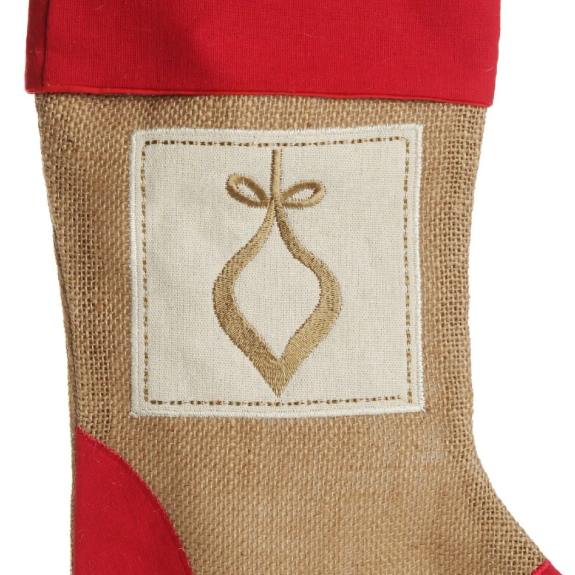 Crafted From Natural Burlap, This Stocking Features An Elegant Embroidered Red Bauble Design And A Soft Red Linen Cuff. The Cuff Can Be Personalised With A Name Of Your Choice. Price Includes Personalisation. Simply Choose A Text Style And Colour And Add The Name Of Your Choice.