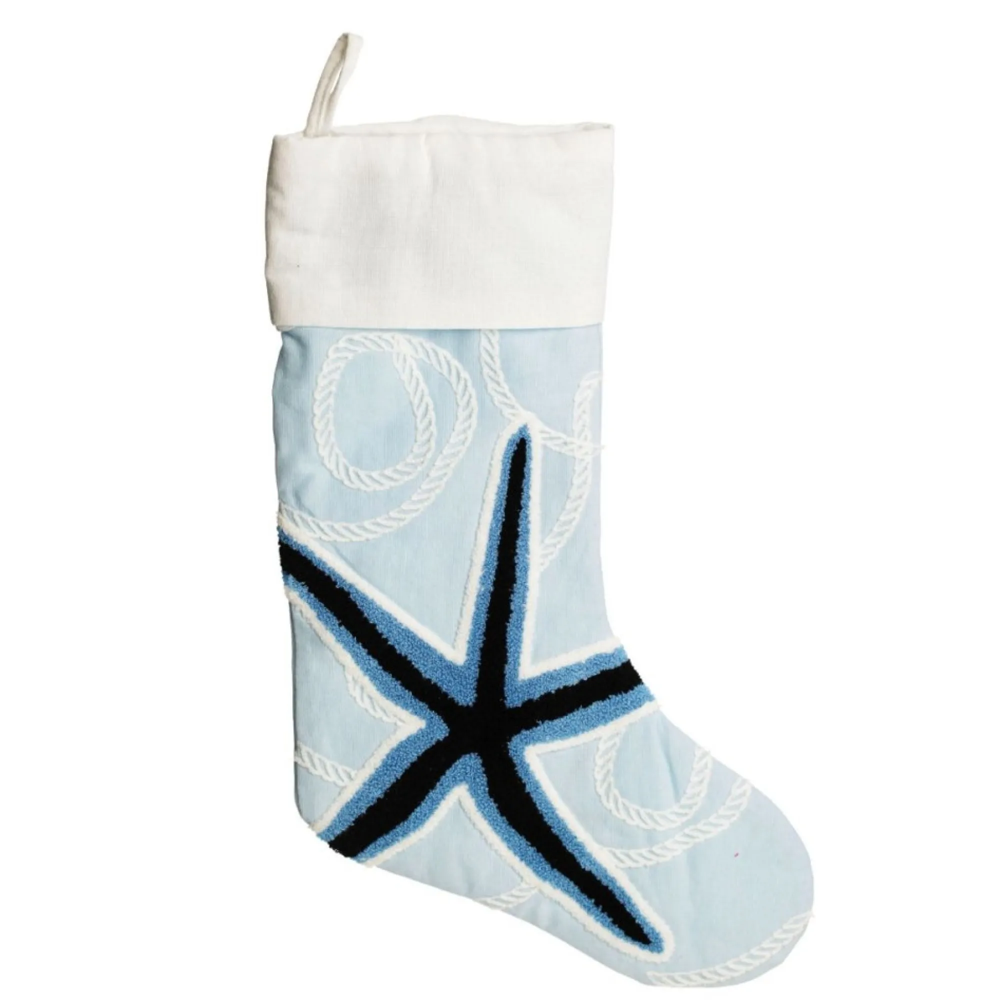 Create A Gorgeous Gift With This Personalised Coastal Starfish Christmas Stocking. This Stocking Is Crafted From Soft Blue Linen, With A White Cuff, And Features A Gorgeous Textured Appliqued Starfish.