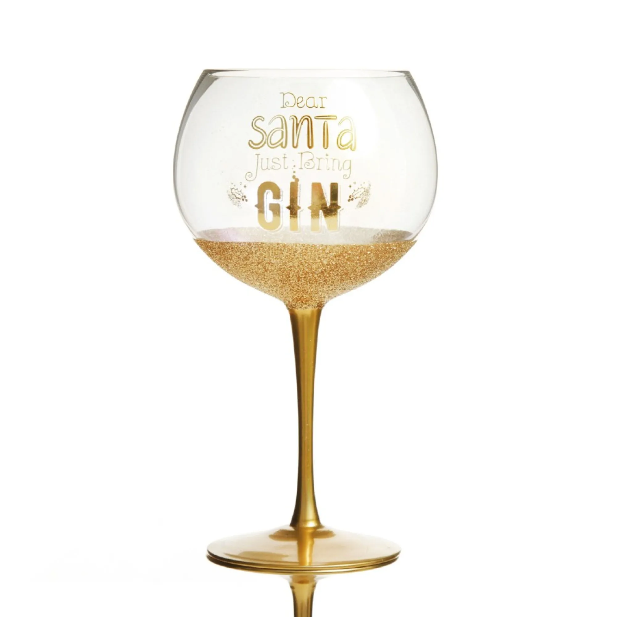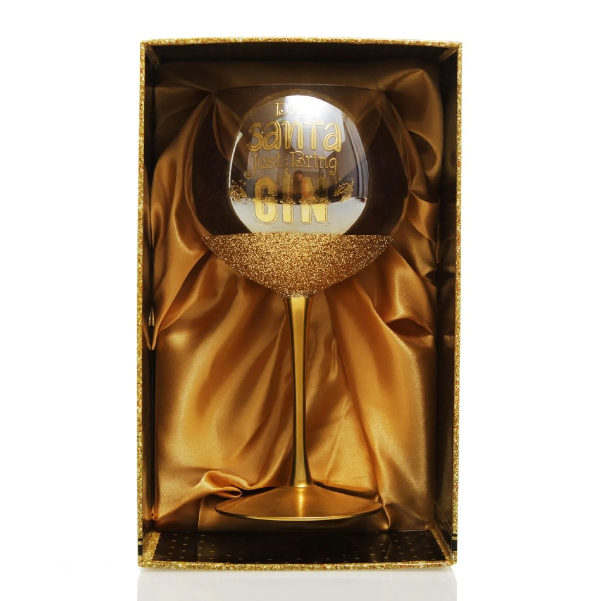 Add Some Sparkle To Your Barware With This Comical Dear Santa Just Bring Gin Christmas Wine Glass. With A Gorgeous Iridescent Rainbow Finish And Classic Gin Glass Shape Hand-Crafted With Care, This Glass Features A Gold Stem, Gold Glitter Base, And The Comical Phrase ‘Dear Santa Just Bring Gin’. Exciting Festive Glasses Make Such Unique And Memorable Gifts For Friends And Loved Ones. Use Them To Sip Your Favourite, Wine, Gin, Or Any Preferred Drink As You Celebrate The Most Wonderful Time Of The Year Together. Glass Comes With A Stylish Satin Lined Gift Box, Perfect To Give To A Family Member Or Friend This Christmas. Create Happy Memories With Friends And Loved Ones This Christmas.