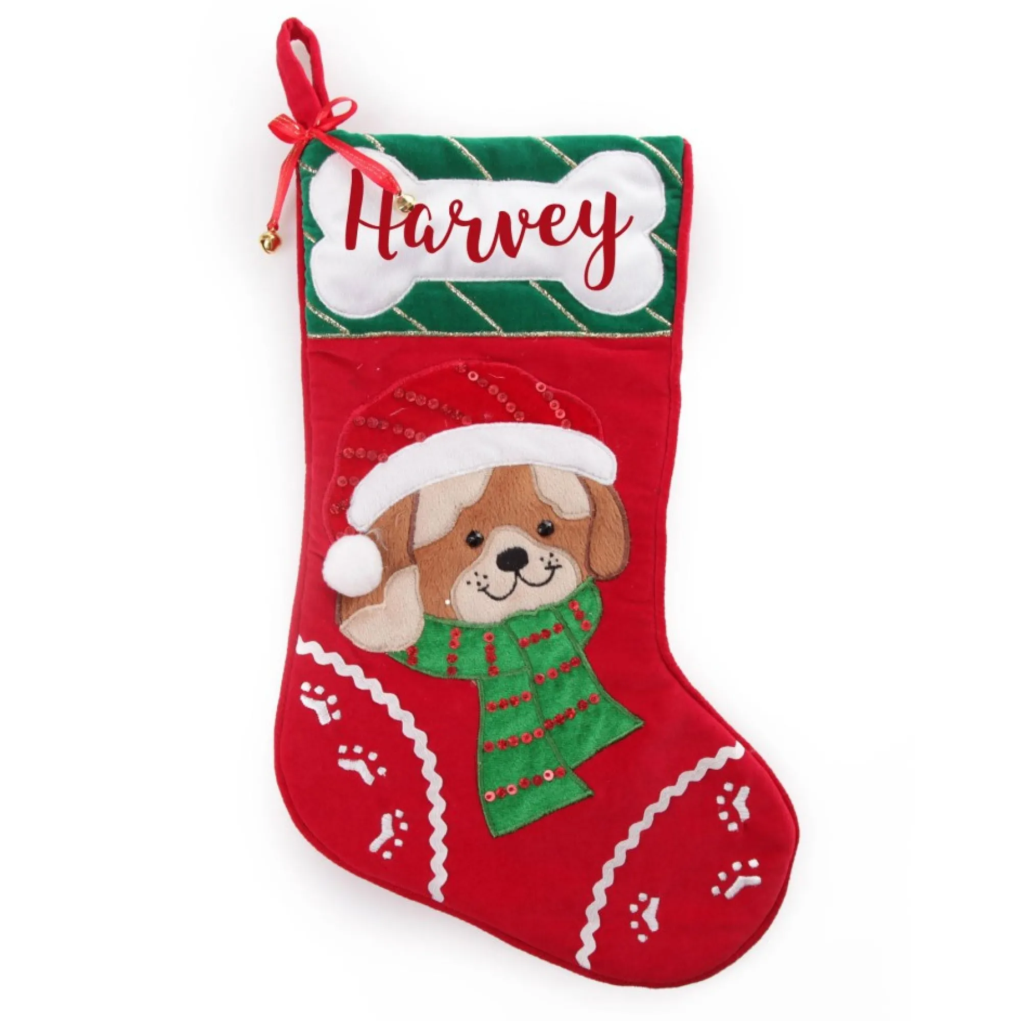 Create Wonderful Memories With This Gorgeous Personalised Dog Christmas Stocking With Bone. Made From A Combination Of Velvet, And Fluffy Fabrics, This Stocking Features An Appliqued Dog With Delicate Braiding And Sequins. Dress Up Your Mantel With A Stocking For Each Member Of The Extended Furry Family And Display Them All Throughout The Christmas Season. Personalised Stockings Add Something Unique And Memorable To Your Home. Create Traditions With This Delightful Personalised Stocking.