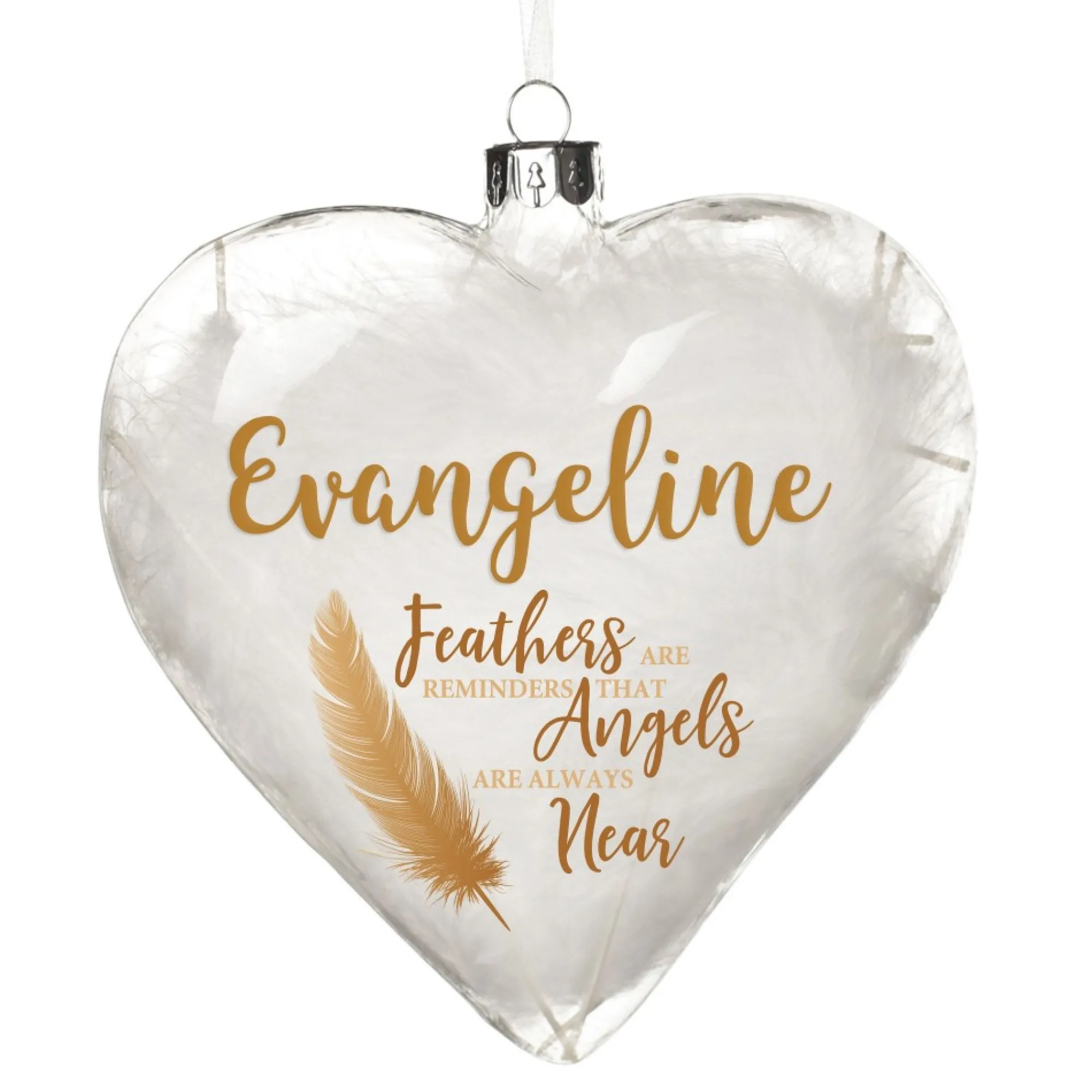 Create An Invaluable Memorial Keepsake Bauble For Loved Ones Passed With Our Personalised Feather Glass Heart – Feathers Are Reminders – Gold. This Clear Glass Heart Shaped Bauble Is Filled With Delicate White Feathers And Features A Gold Decal With The Message ‘Feathers Are Reminders That Angels Are Always Near’, Along With The Name Of Your Choice In Beautiful Vinyl Lettering & Personalisation Colour. We Know Nothing Can Ease The Pain Of Loss But We Are Here To Help You Let Your Love Shine Bright And Honour The Life Of Those You Hold Dearest. Remember Those Who Have Passed With A Precious Keepsake Hung Amongst Your Christmas Display Or Keep In Your Home All Year Round To Keep Their Memory Alive. Hold Loved Ones In Your Heart, Mind, And Home Forever With This Invaluable Keepsake.