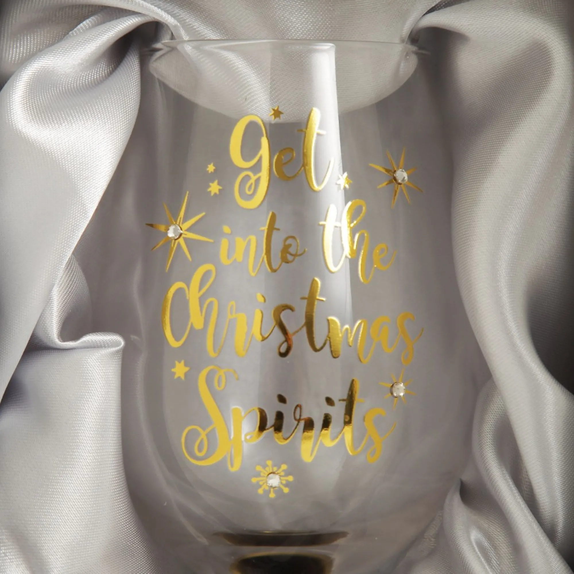 This Chic Personalised Wine Glass Features A Beautiful Gold Stem With Cursive Gold Foil Print Which Reads ‘Get Into The Christmas Spirits’. It Holds Approximately 430Ml Of Your Favourite Naughty Drink And Is Personalised With Glitter Calligraphy On The Stem Base. Your ‘Get Into The Christmas Spirits’ Wine Glass Also Comes With A Stylish Satin Lined Gift Box, Perfect To Give To A Family Member Or Friend This Christmas.