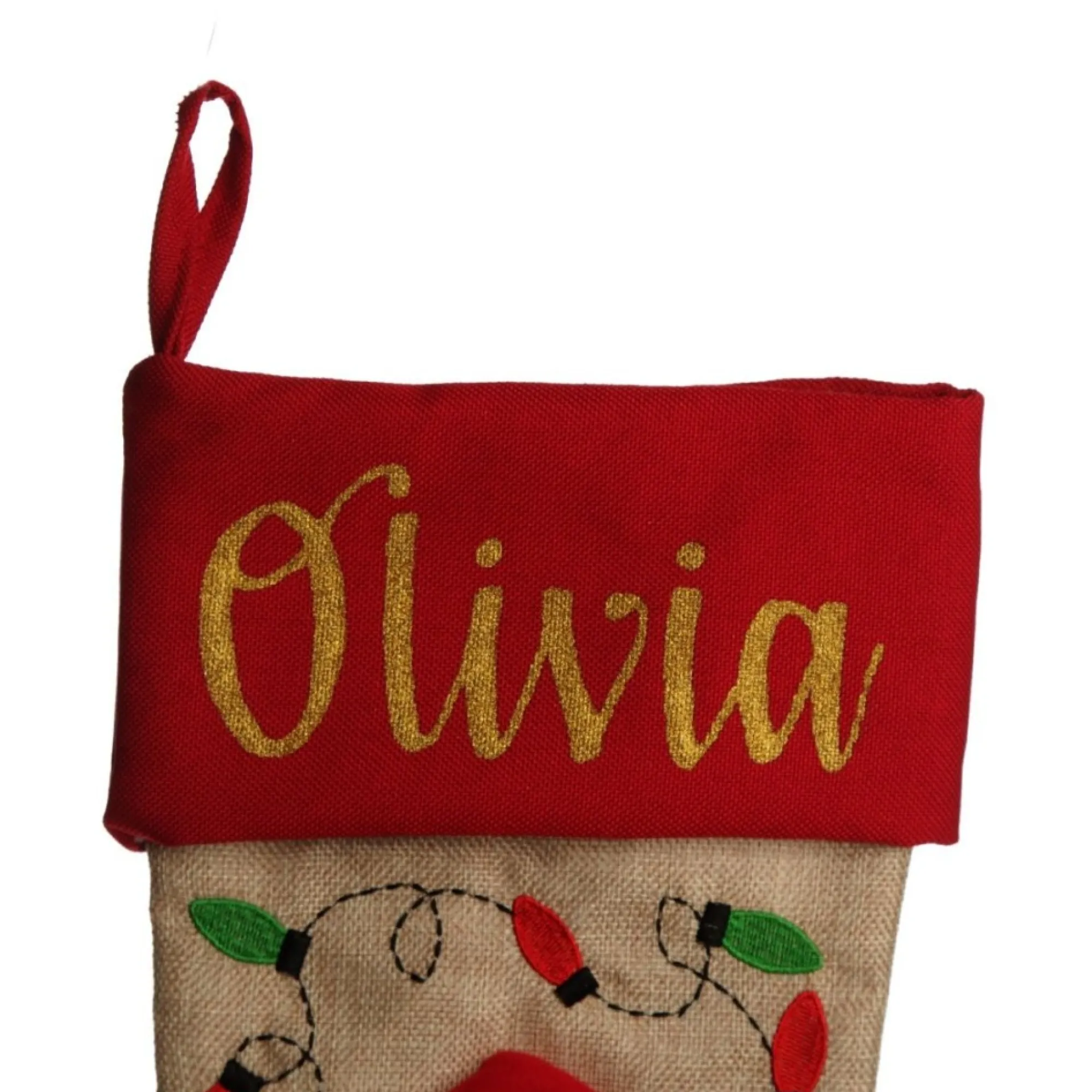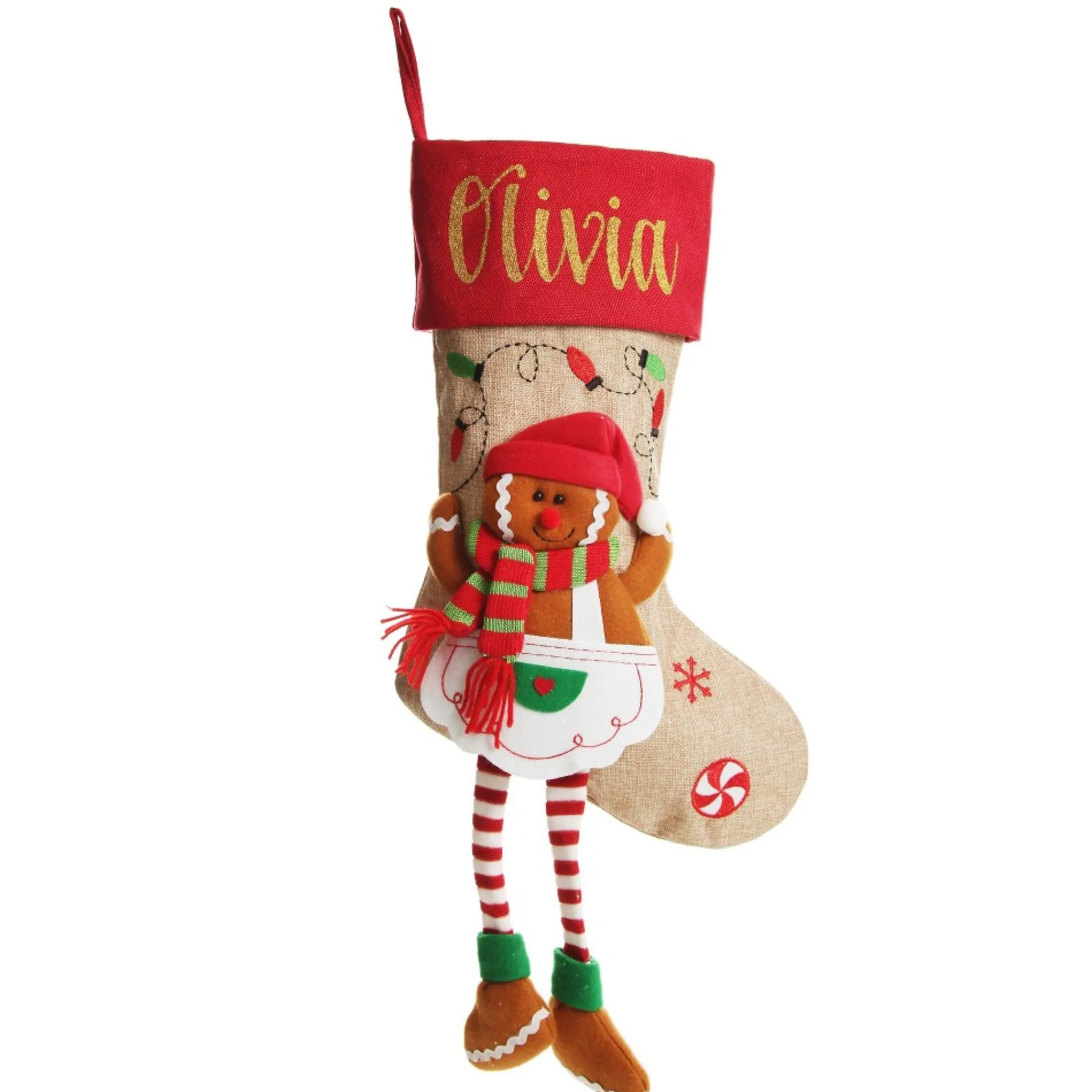 Create A Brilliant And Playful Display With This Personalised Gingerbread Girl Christmas Stocking With Dangly Legs. Made From A Combination Of Textured Materials, This Stocking Is Embellished With A Sewn Red And Green Christmas Light Design, This Stocking Also Features A 3D Felt Gingerbread Girl With Dangly Legs. Bring Out As A Family Favourite Each Year To Dress Up Your Mantel And Bring Christmas Cheer To Your Home!
