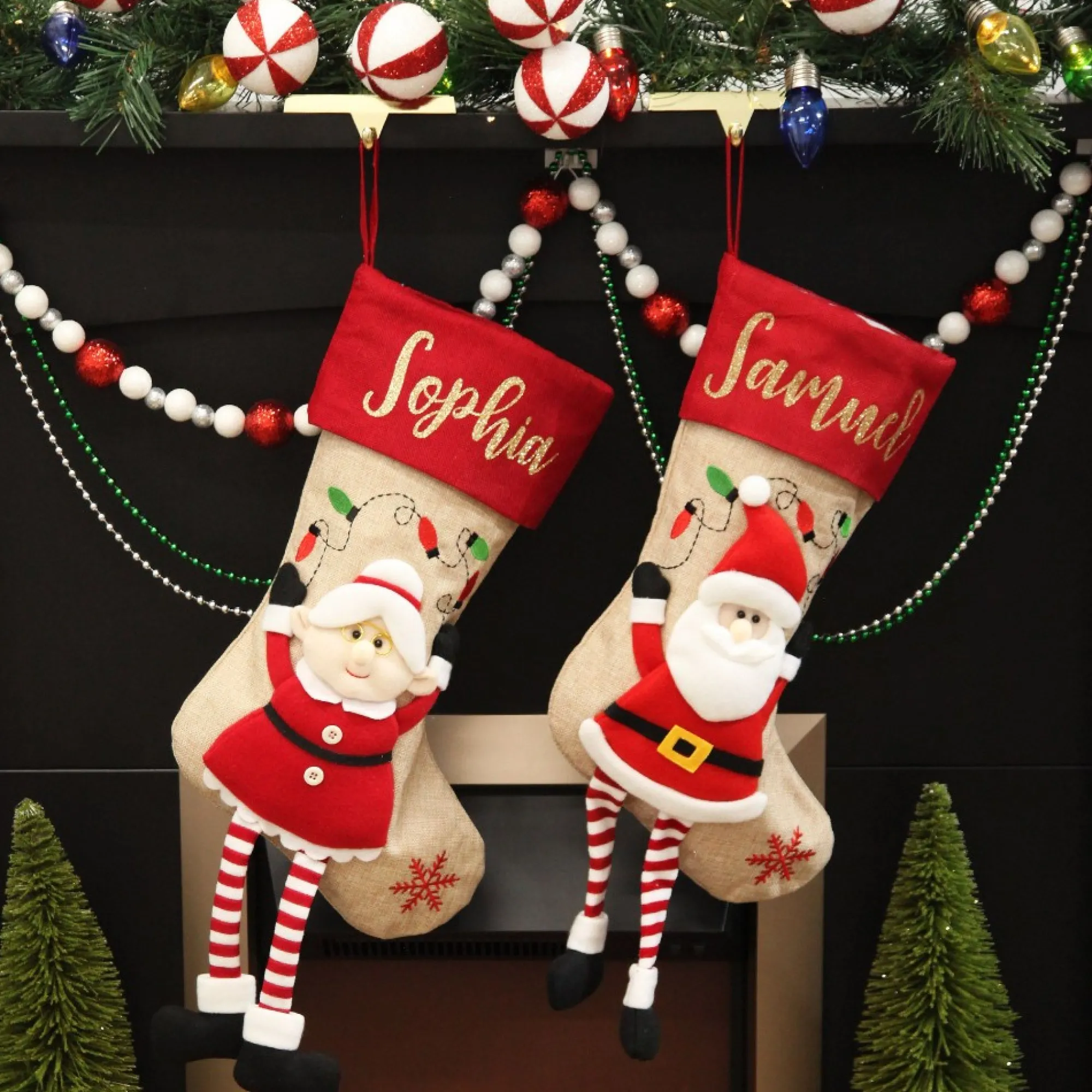 Stop Santa In His Tracks This Christmas Season With Our Delightful Personalised Mrs Claus Christmas Stocking With Dangly Legs – The Perfect Way To Create A Sweet And Joyful Display. Crafted From A Combination Of Textured Materials And Embellished With A Sewn Red And Green Christmas Lights Design, This Stocking Features A 3D Felt Mrs Claus With Dangly Legs.