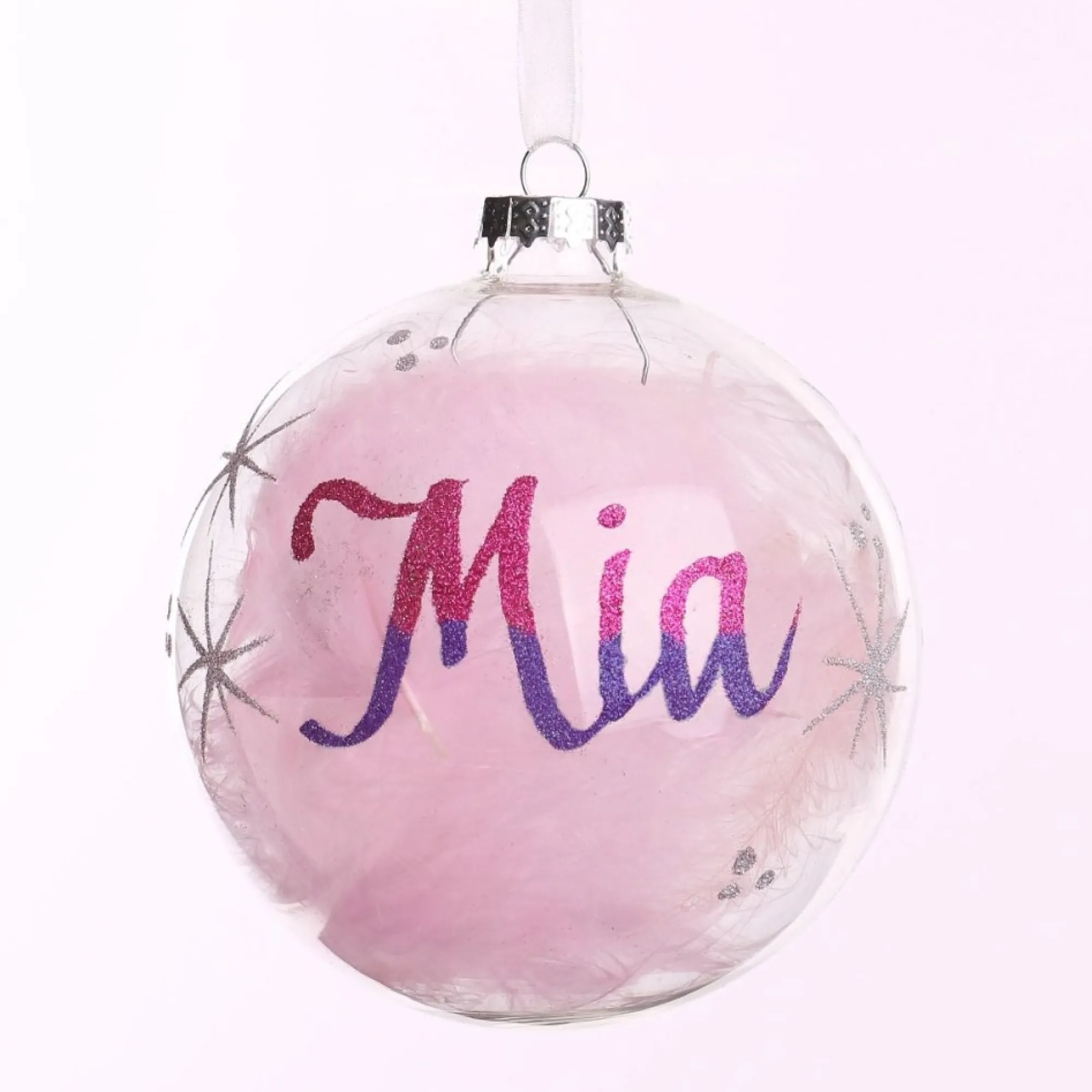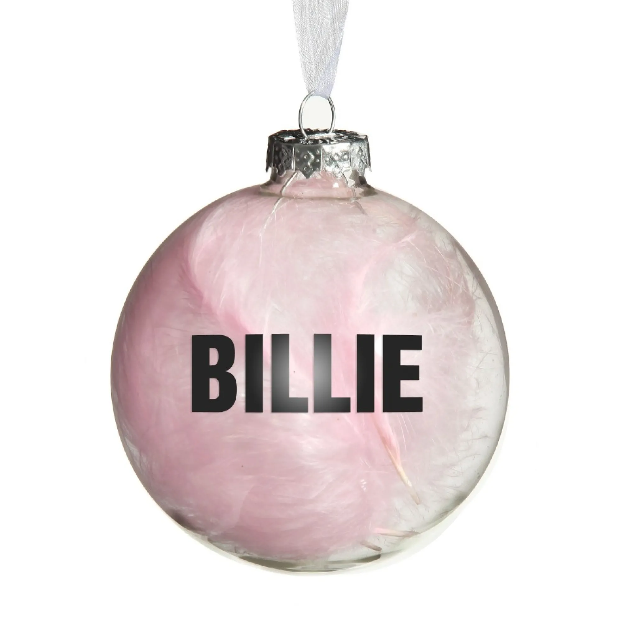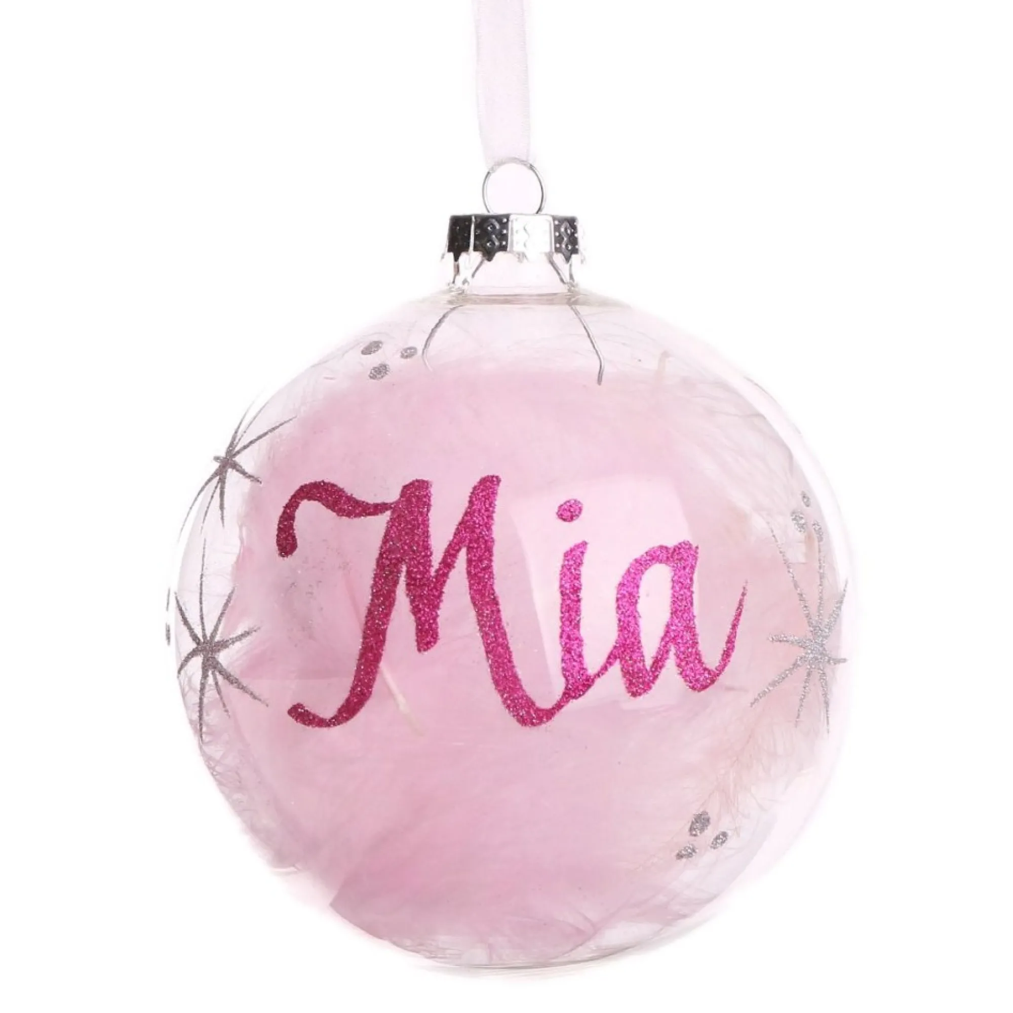 Add Colour And Elegance To Your Home With This Personalised Pink Feather Clear Glass Christmas Bauble Crafted From Seamless, High-Quality Glass, With A Shiny Clear Finish, This Bauble Is Filled With Delicate And Exquisite Pink Feathers. Featuring A Silver Metal Top And Elegant Ribbon, This Bauble Is Ready To Hang On Your Christmas Tree Or On One Of Our Chrome Display Hangers.