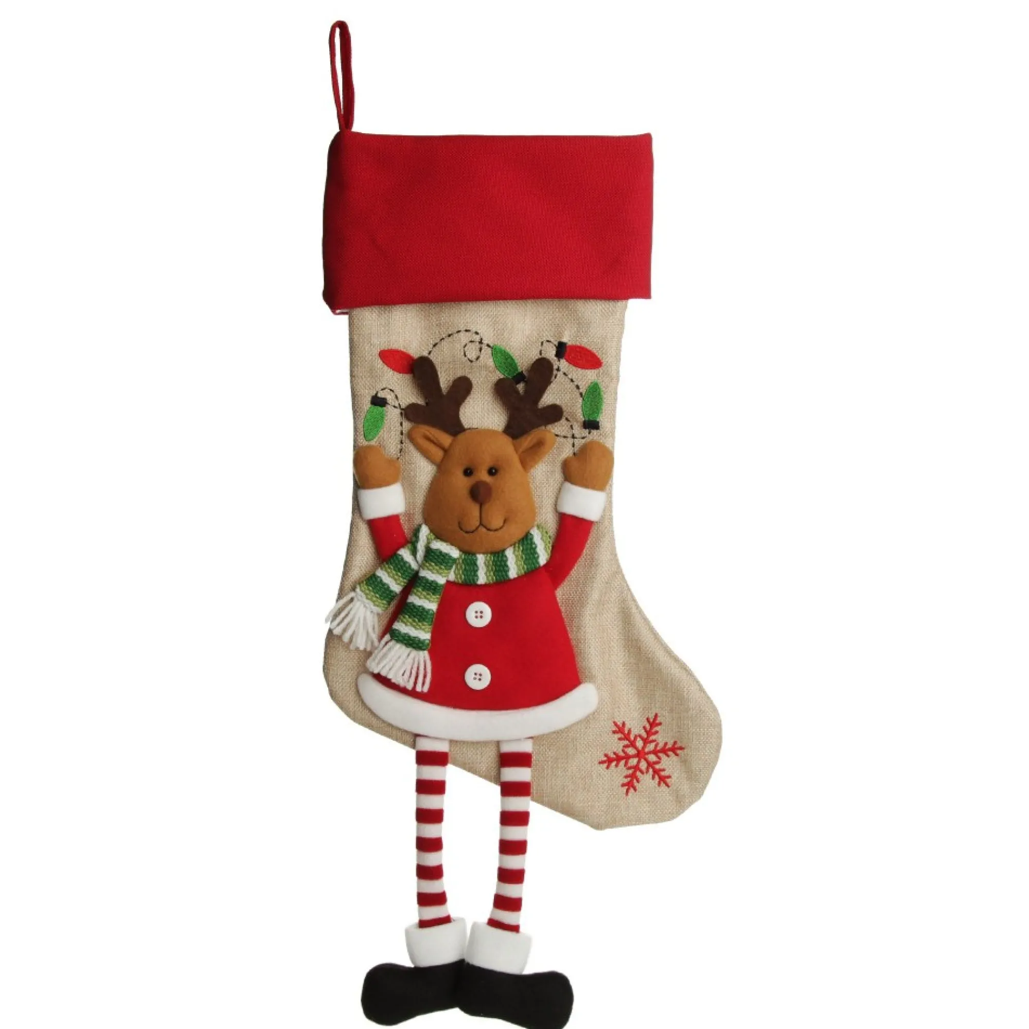 Create A Sweet And Joyful Display With This Delightful Personalised Reindeer Christmas Stocking With Dangly Legs. Crafted From A Combination Of Textured Materials And Embellished With A Sewn Red And Green Christmas Lights Design, This Stocking Features A 3D Felt Reindeer With Dangly Legs. Popular For Children Of All Ages, Or Even As Part Of A Set For The Whole Family Using Our Other Dangly Leg Designs: Santa, Boy Elf, Girl Elf, Gingerbread Girl And Gingerbread Boy. Dress Up Your Mantel With A Stocking For Each Member Of The Family And Display Them All Throughout The Christmas Season. Personalised Stockings Add Something Unique And Memorable To Your Home And Also Make Excellent Gifts For Friends And Family! This Stocking Is Perfect For A Bright Or Traditional Christmas Theme With Red, Green, Gold, And Silver Tones. Spread Joy This Christmas With This Gorgeous Personalised Stocking.