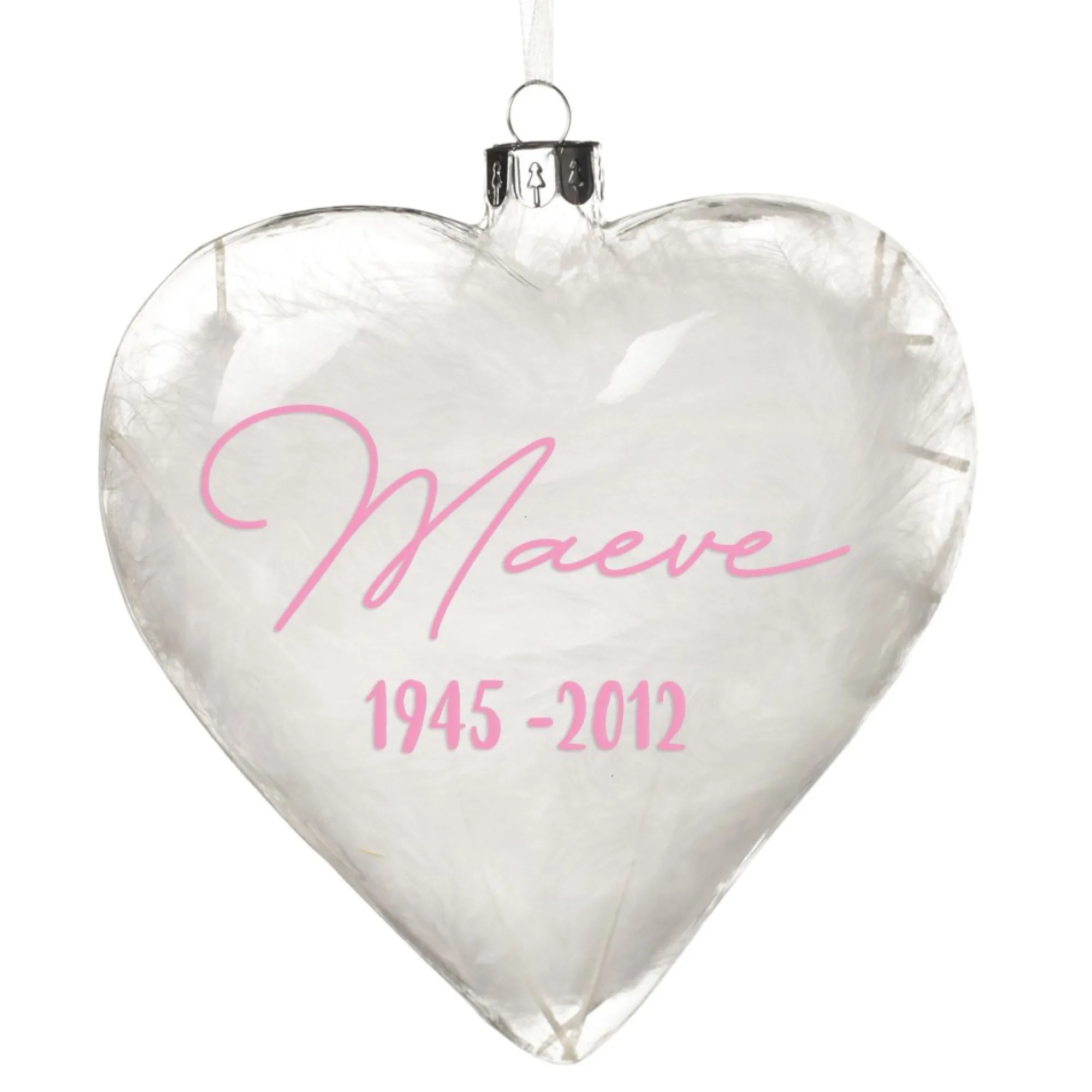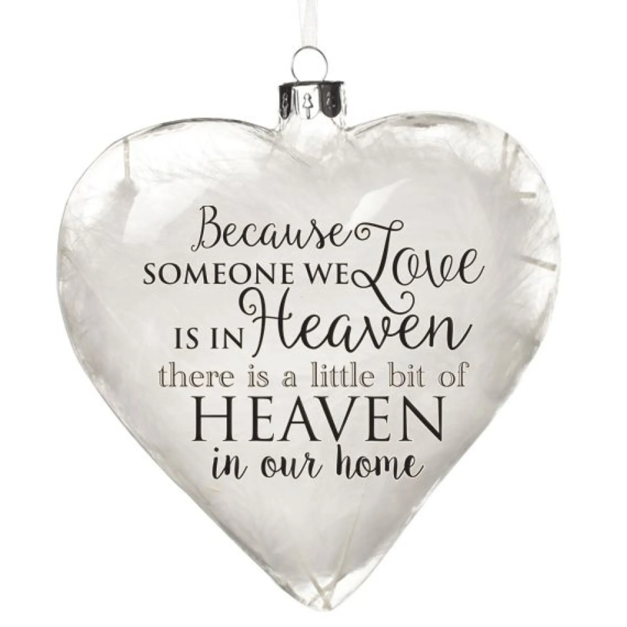 Keep Loved Ones In Your Heart And Home Forever With A Memorial Keepsake Ornament Using Our Personalised Glass Heart – Heaven In Our Home. This Clear Glass Heart Shaped Ornament Is Made From High Quality Glass, Is Filled With Delicate White Feathers And Features A Decal With The Message ‘Because Someone We Love Is In Heaven There Is A Little Heaven In Our Home’.