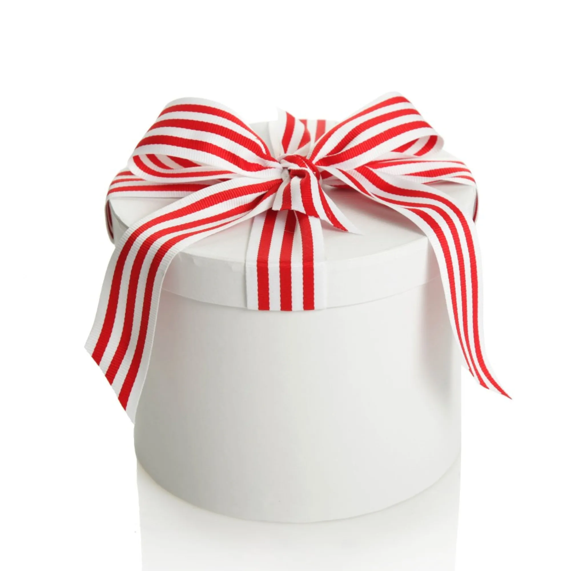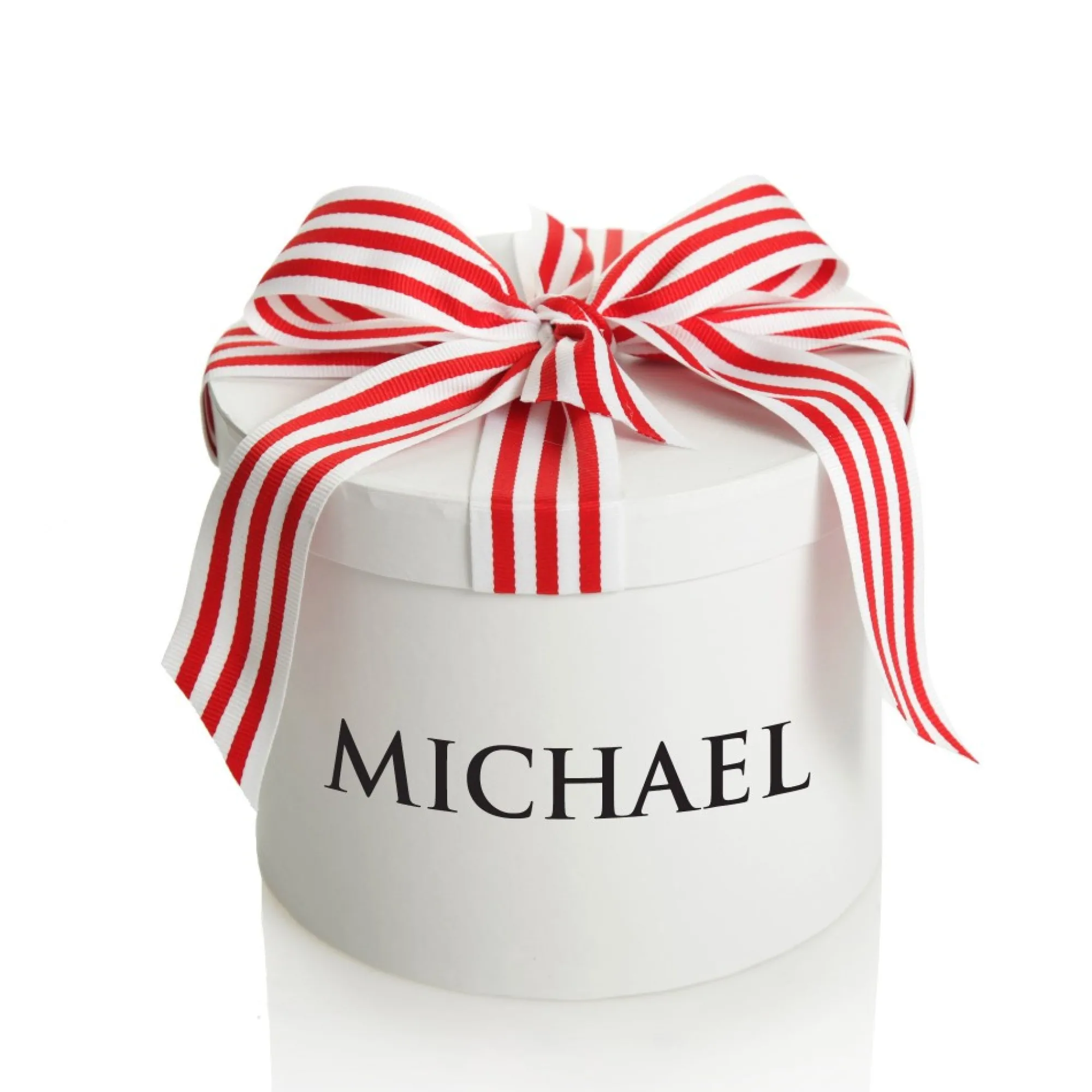 This Gorgeous Personalised White Round Gift Box Finished With Candy Cane Ribbon Bow Is The Perfect Way To Add An Extra Thoughtful Touch To Your Gift.