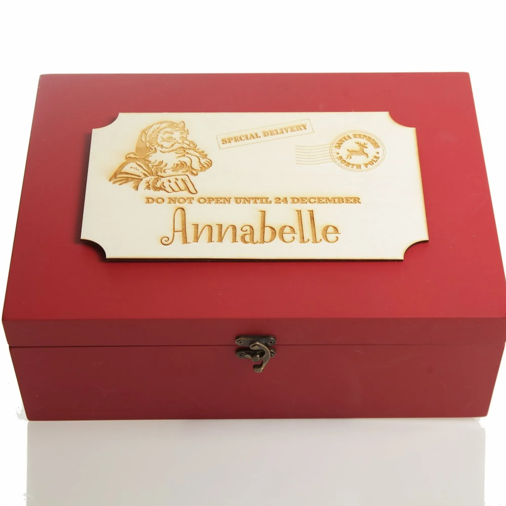 Add A Little Excitement To Your Christmas Eve Traditions With Our Personalised Red Wooden Christmas Eve Box With Express Delivery Plaque.