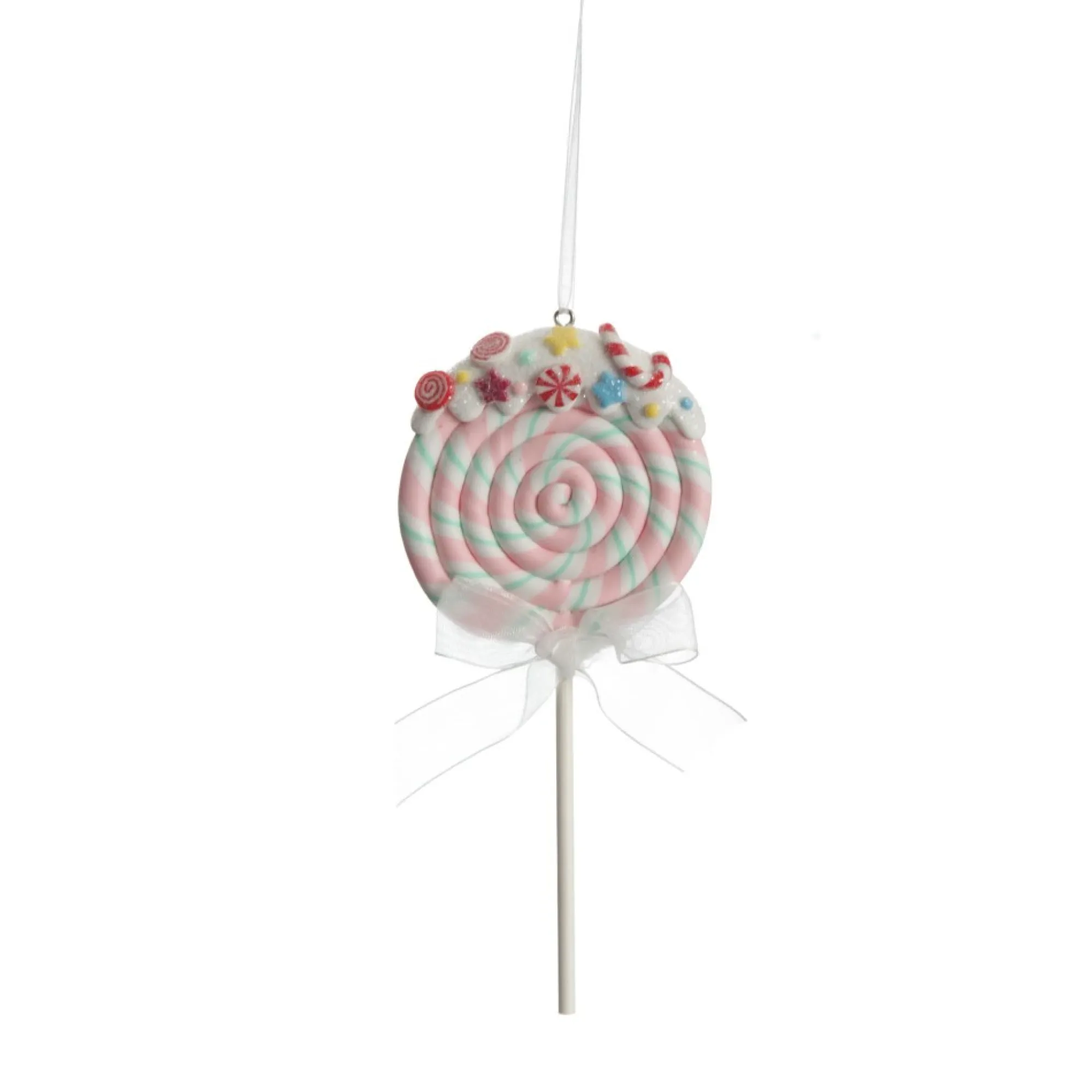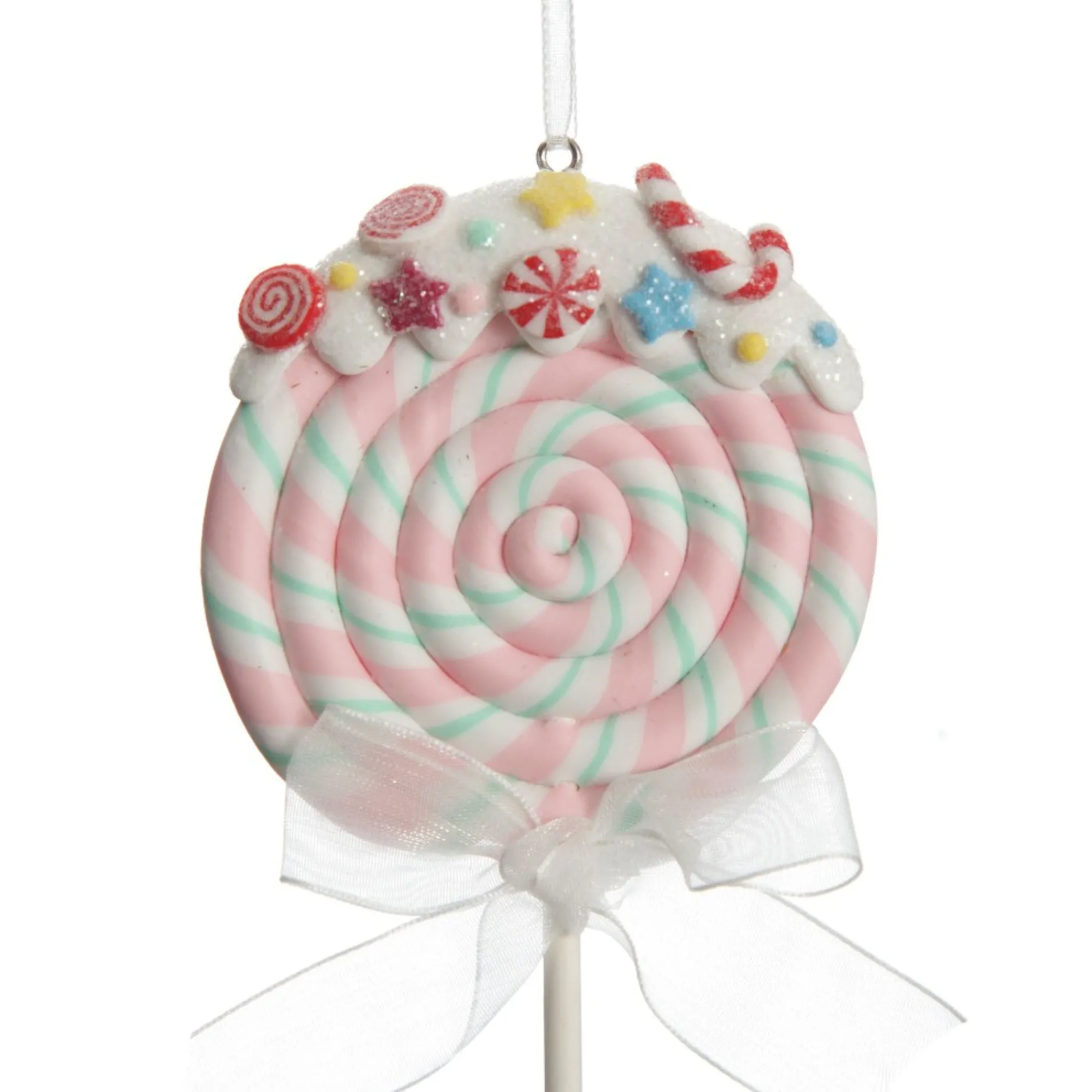 Sweeten Up Your Christmas Tree With This Pink Candy Swirl Lollipop Christmas Tree Decoration. This Sugar-Coated Decoration Features A Pink, White And Mint Swirl Lollipop Crafted From Durable Polymer Clay, With Glitter Frosting And Candy Embellishments On Top. An Organza Ribbon Bow Adorns The Lollipop Stick And A Ribbon Hangs From The Top For Easy Placement On Your Tree. What A Sweet And Exciting Addition This Lollipop Would Make To Your Christmas Tree, Garlands, Wreaths And More. It Would Also Make An Exciting Finishing Touch When Gift Wrapping Or Creating Table Place Settings For Your Christmas Day Feast. Perfect For A Peppermint Candy Christmas Decor Theme Paired With Vibrant Red, Green, White, And Silver Tones, Adorable Candy-Themed Decor And Glitter Galore!