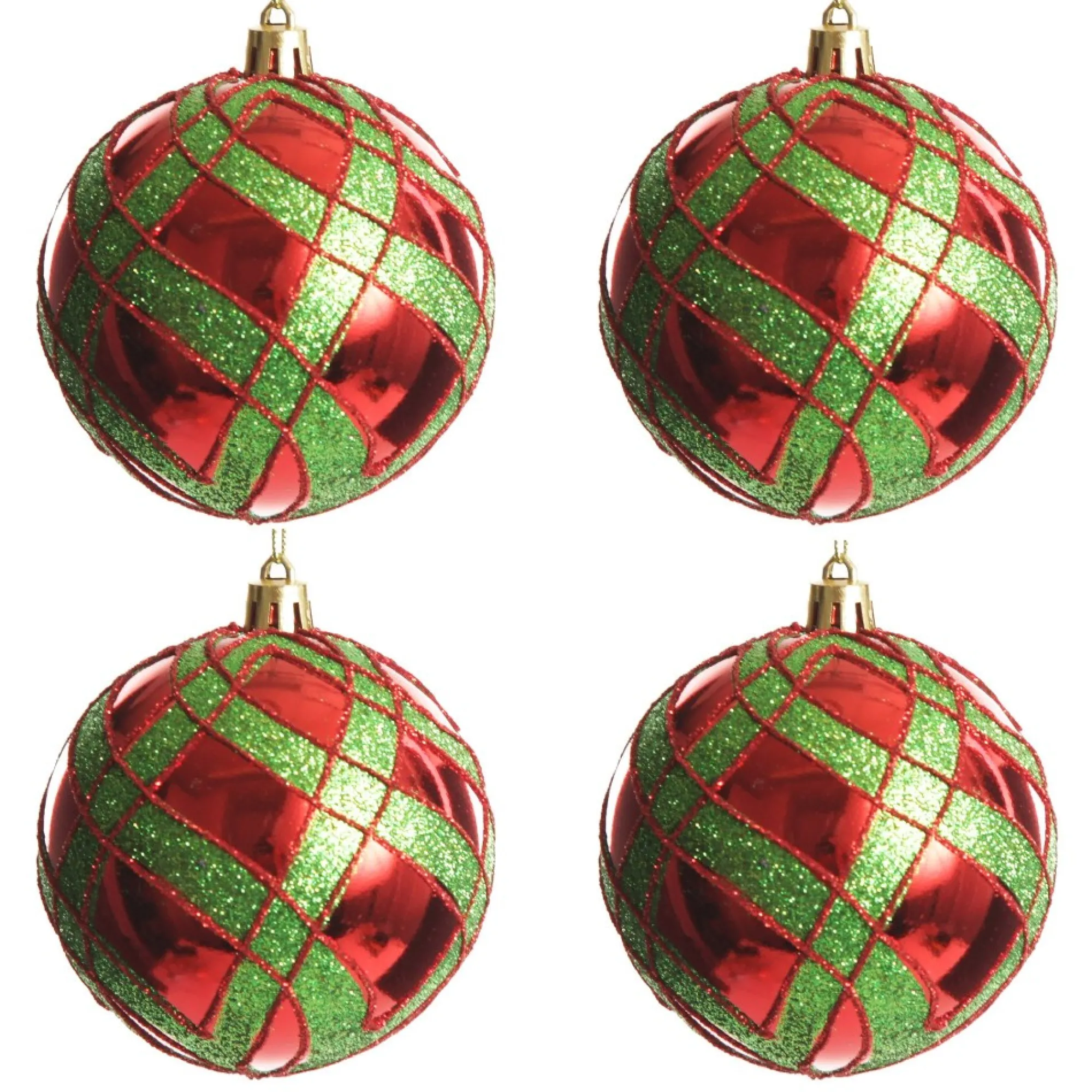 Crafted Durable And Lightweight Acrylic With A Gloss Finish, This Set Of Four Baubles Feature A Unique Green And Red Glitter Piping Forming An Intricate Diamond Pattern. The Baubles Come With A Metallic String, Ready To Hang On Your Tree.
