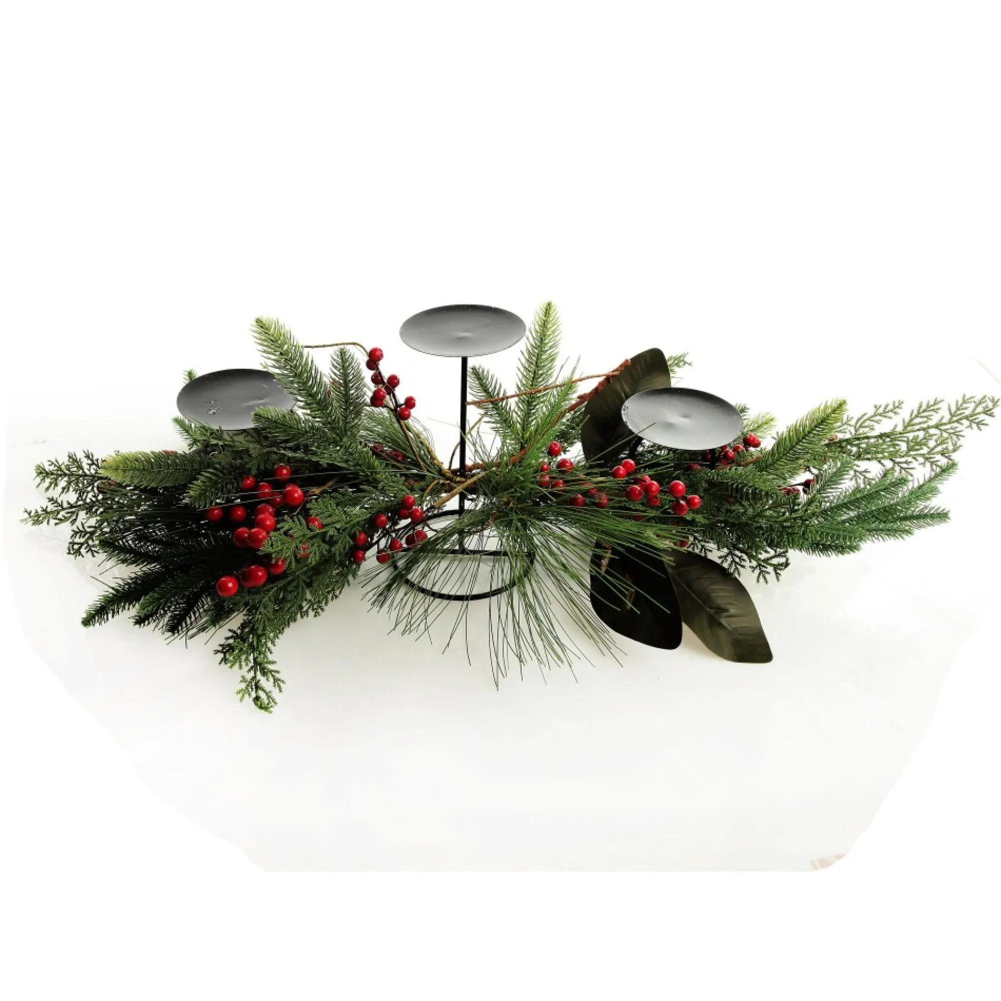 Create A Lush And Extravagant Festive Display With This Red Berry Mixed Leaf Christmas Table Centrepiece Candle Holder. Crafted With A Metal Base Adorned With Lush Green, Realistic Foliage, This Centrepiece Features Vibrant Red Berries, And Three, Tiered Candle Holders That Extend From The Metal Base.