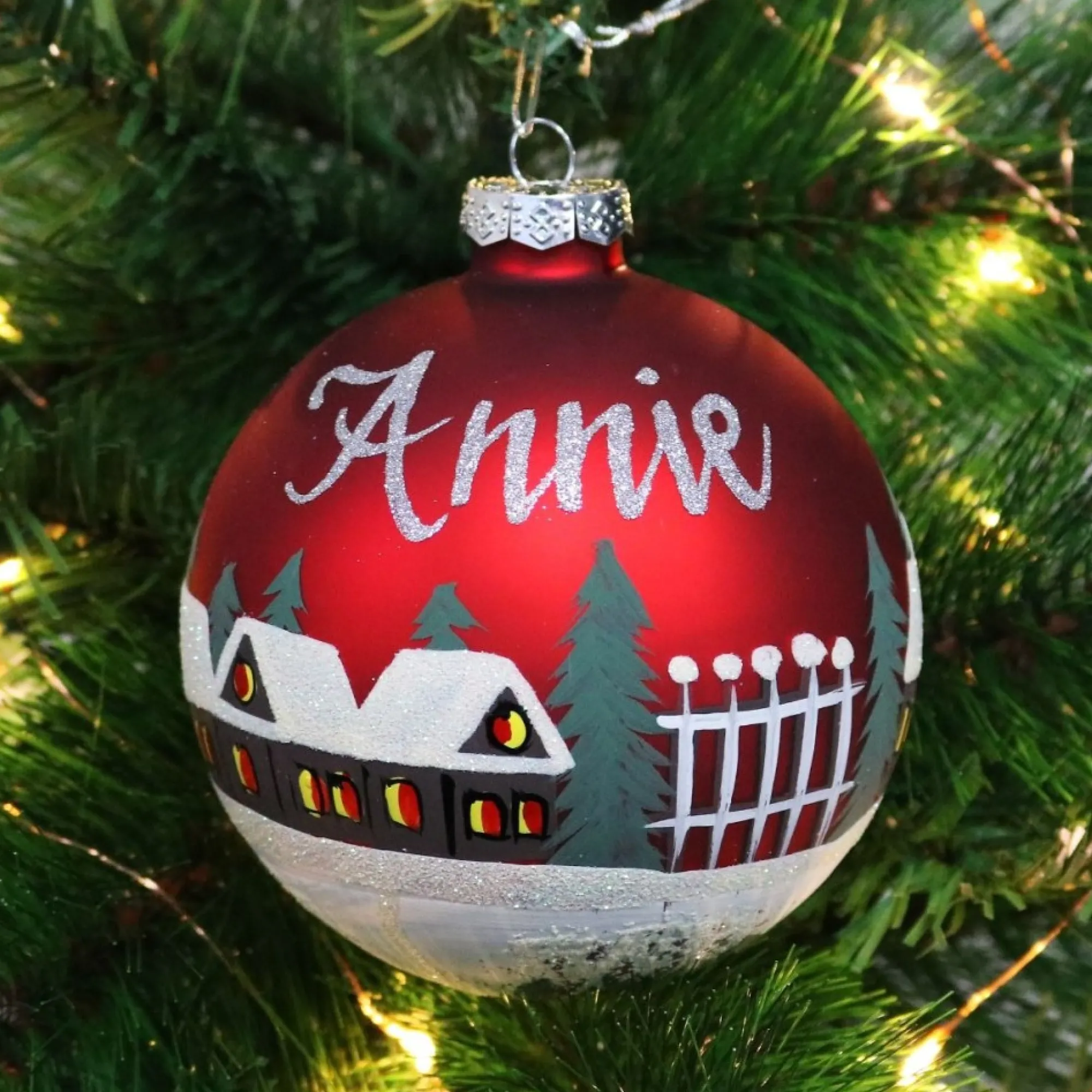 Spread Christmas Cheer In Your Home With This Delightful Hand Painted Red Christmas Village Bauble. Crafted From Seamless, High Quality Red Glass, This Bauble Has A Matt Finish And Features An Intricate, Hand Painted Christmas Village Design With Glitter Details. It Also Comes With A Metal Top And Metallic Thread, Ready To Hang On Your Tree. Bauble Can Be Personalised With A Name And Year Of Your Choice In Our Unique Style Of Glitter Calligraphy. Personalised Baubles Make A Unique And Memorable Addition To Any Christmas Display. Hang Them On Your Tree Of Showcase Them On A Mantel Using One Of Our Display Hangers Or Stands. They Also Make Special Gifts For Your Friends And Family. Create Fun Family Traditions This Christmas With This Delightful Personalised Glass Bauble.