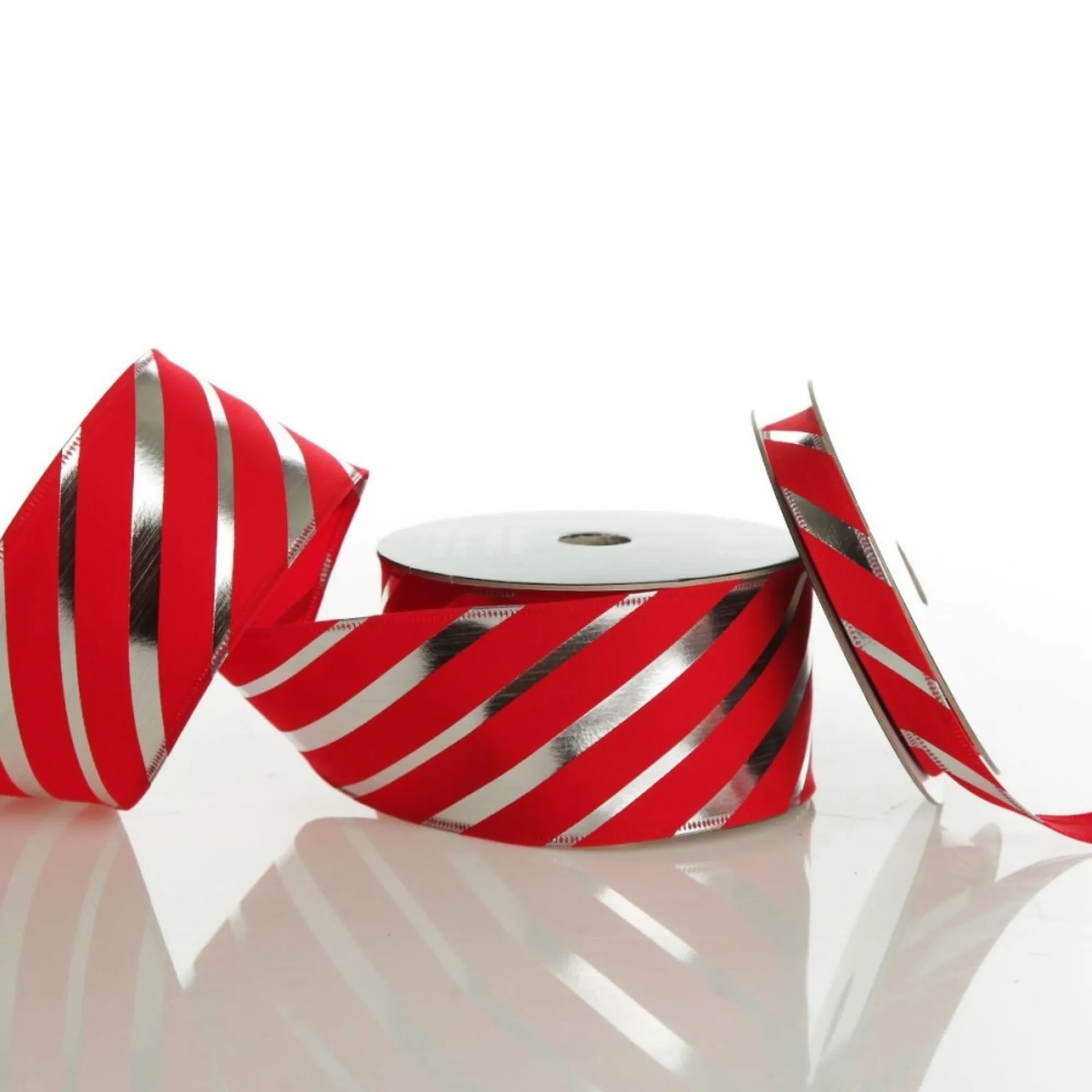 Red & Silver Diagonal Stripe Wired Ribbon New