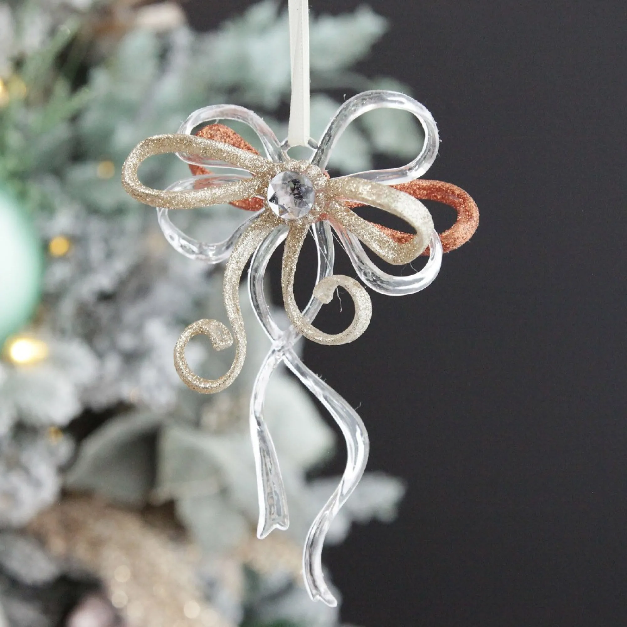 Add Something Unique To Your Christmas Tree With Our Rose Gold Glitter And Clear Acrylic Bow Tree Decoration. Crafted From Durable Acrylic, This Decoration Features A Unique And Intricate Bow Design In A Mixture Of Clear And Rose Gold And Champagne Glitter Swirls. A Diamante Adorns The Middle Of The Bow, And A Ribbon Is Attached To The Top For Easy Hanging On Your Tree. This Unique Decoration Is A Perfect Embellishment For Your Christmas Tree. You Could Even Use It To Adorn Garlands And Wreaths Or As A Unique Embellishment While Gift Wrapping And Creating Table Place Settings. The Rose Gold And Champagne Glitter Make This Perfect For A Boho Glam Christmas Decor Theme. Pair With Other Neutral Tones, Pink Elements, Glitter, And Wooden Decorations To Create A Lovely Display.