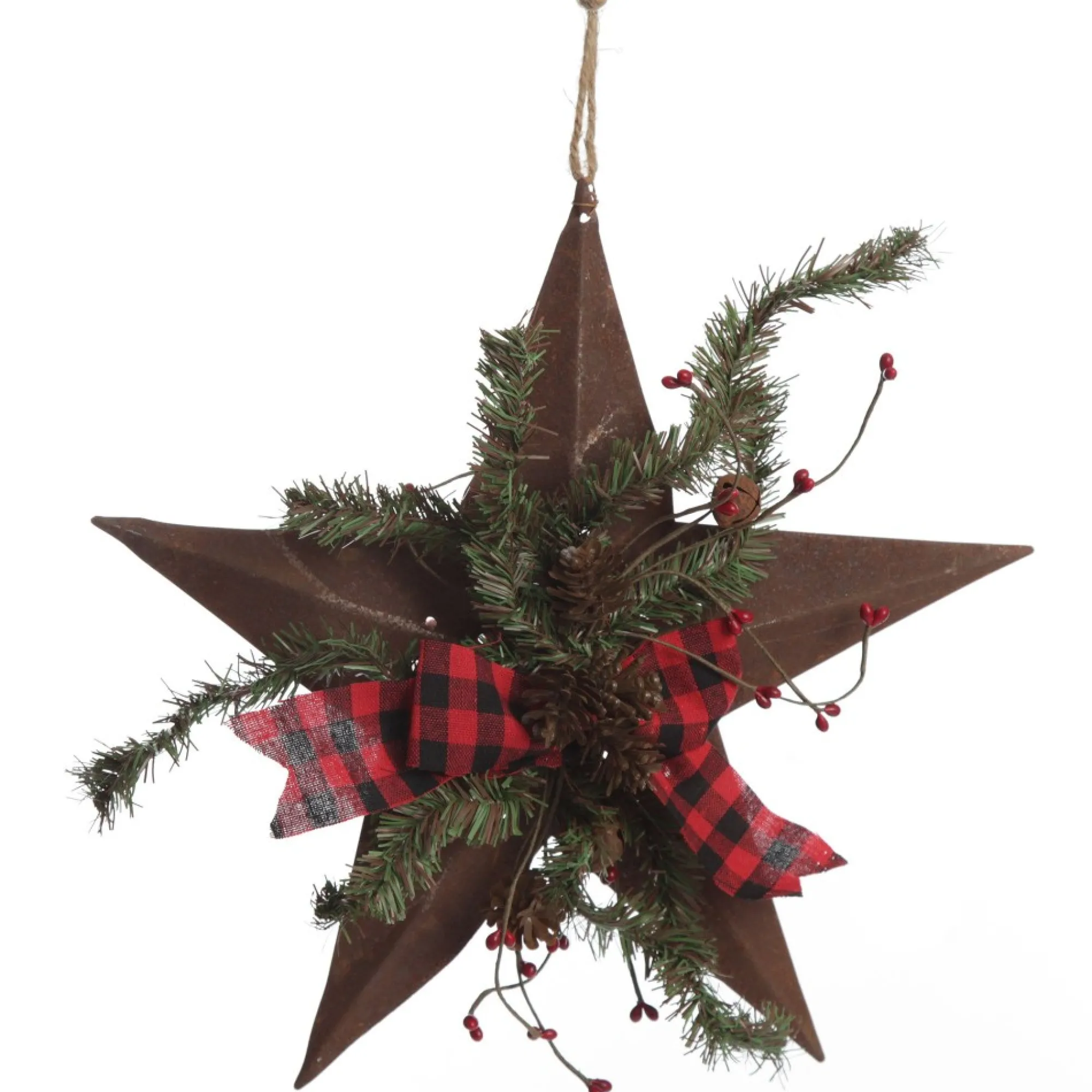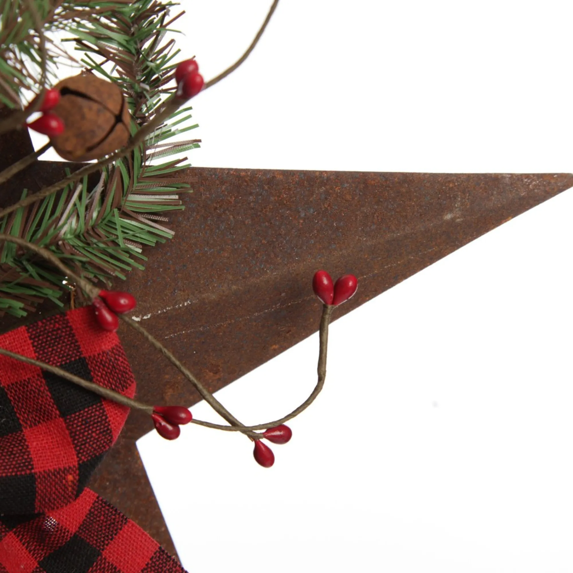 Celebrate In Style And Add Cosy Christmas Decor To Your Home With Our Rusted Tin Star Tree Topper With Buffalo Check Bow And Pine. Featuring A Rusted Tin Star With Foliage, Pinecone, And Red Berry Embellishments. A Red And Black Buffalo Check Bow Also Adorns The Star For An Extra Cosy And Rustic Farmhouse Feel.