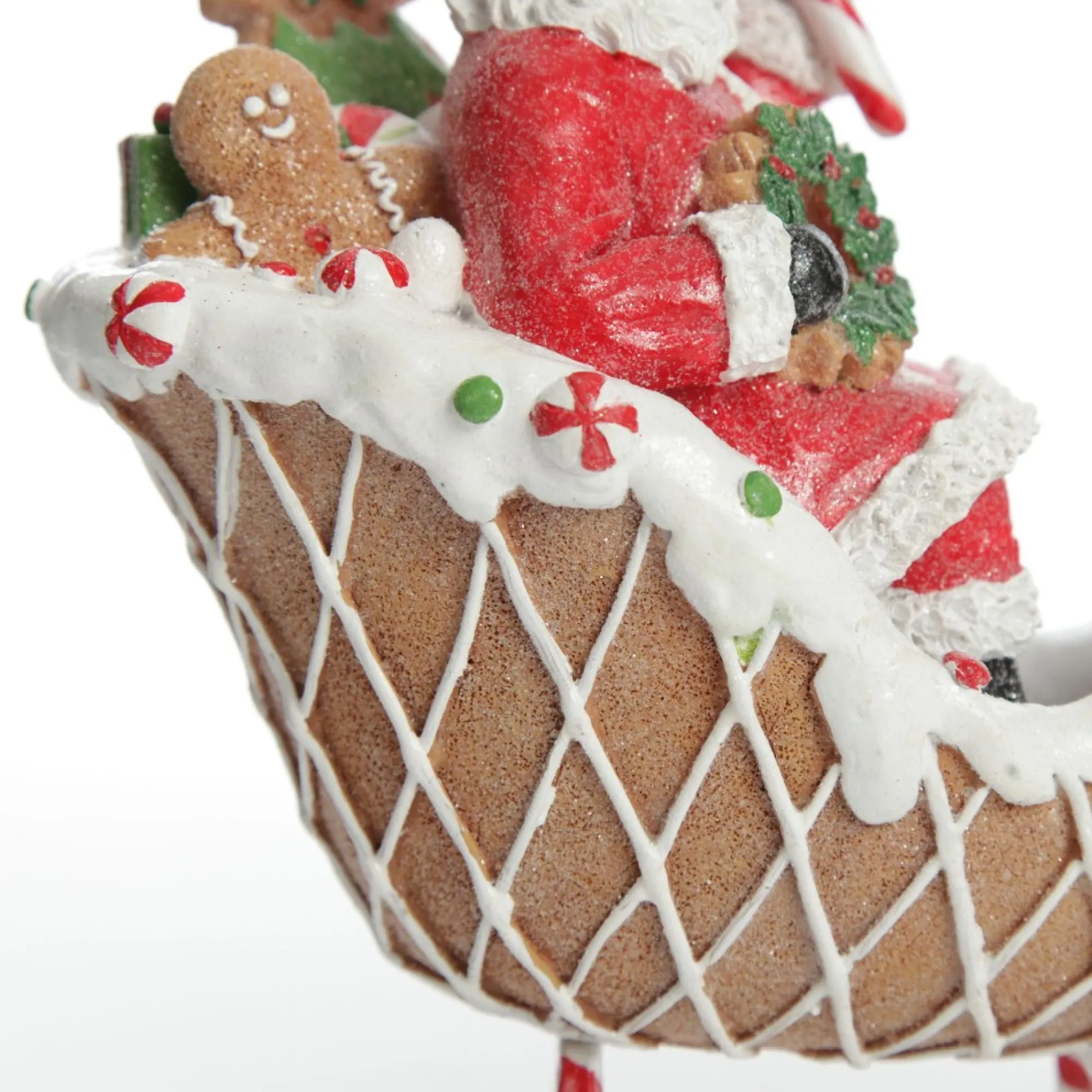 Create A Sweet Festive Display With Our Santa In Gingerbread Sleigh Christmas Ornament. Crafted From Durable Materials With A Sugar-Coated Finish, This Ornament Features Santa Riding In A Gingerbread Sleigh With White Frosting Details, Candy Cane Striped Base, And Cookie Embellishments. A Unique And Charming Ornament That Almost Looks Good Enough To Eat! Display On Any Table Or Surface In Your Home As Part Of A Festive Vignette Or Centrepiece To Bring Sugar-Coated Christmas Charm. Perfect For A Vibrant Peppermint Candy Christmas Decor Theme.