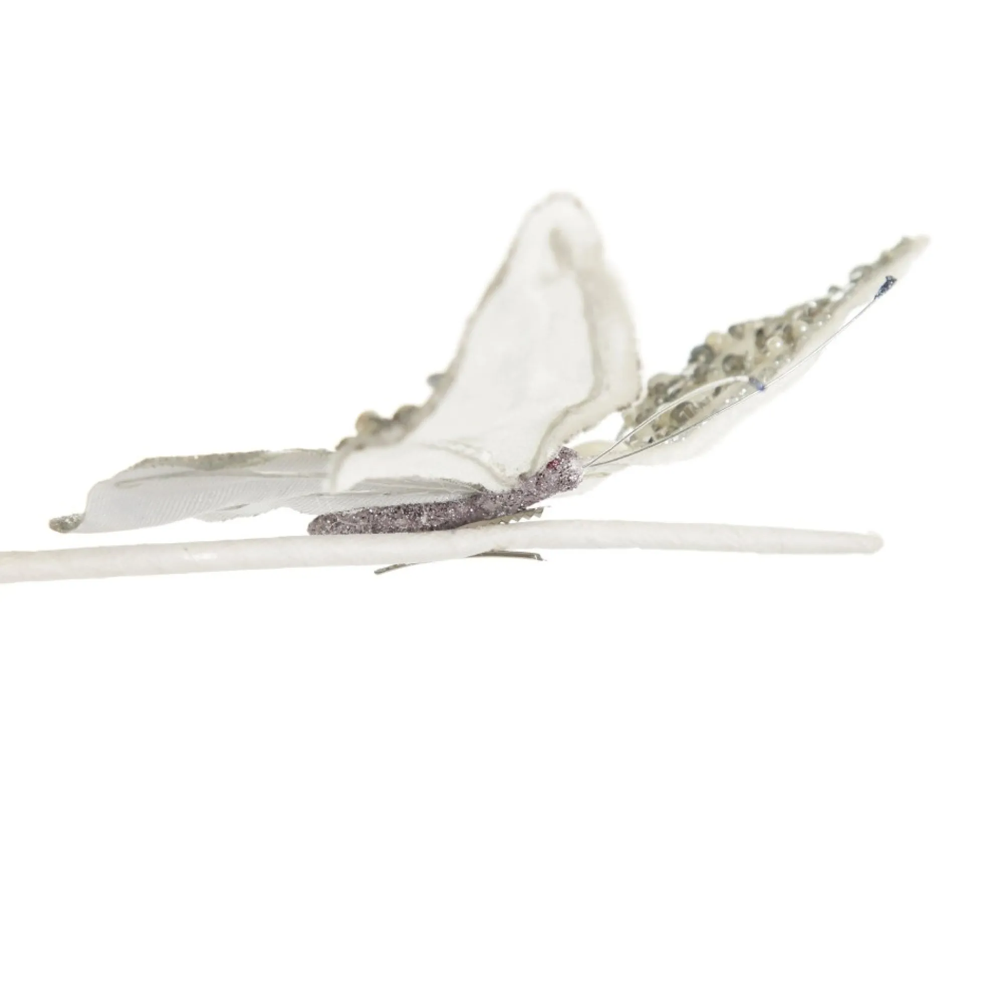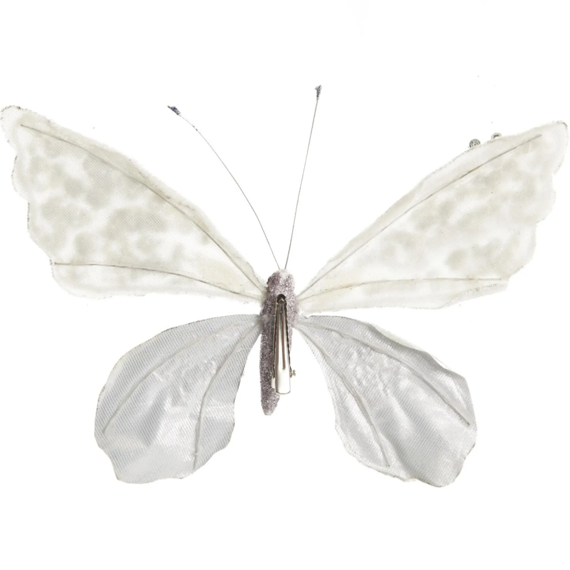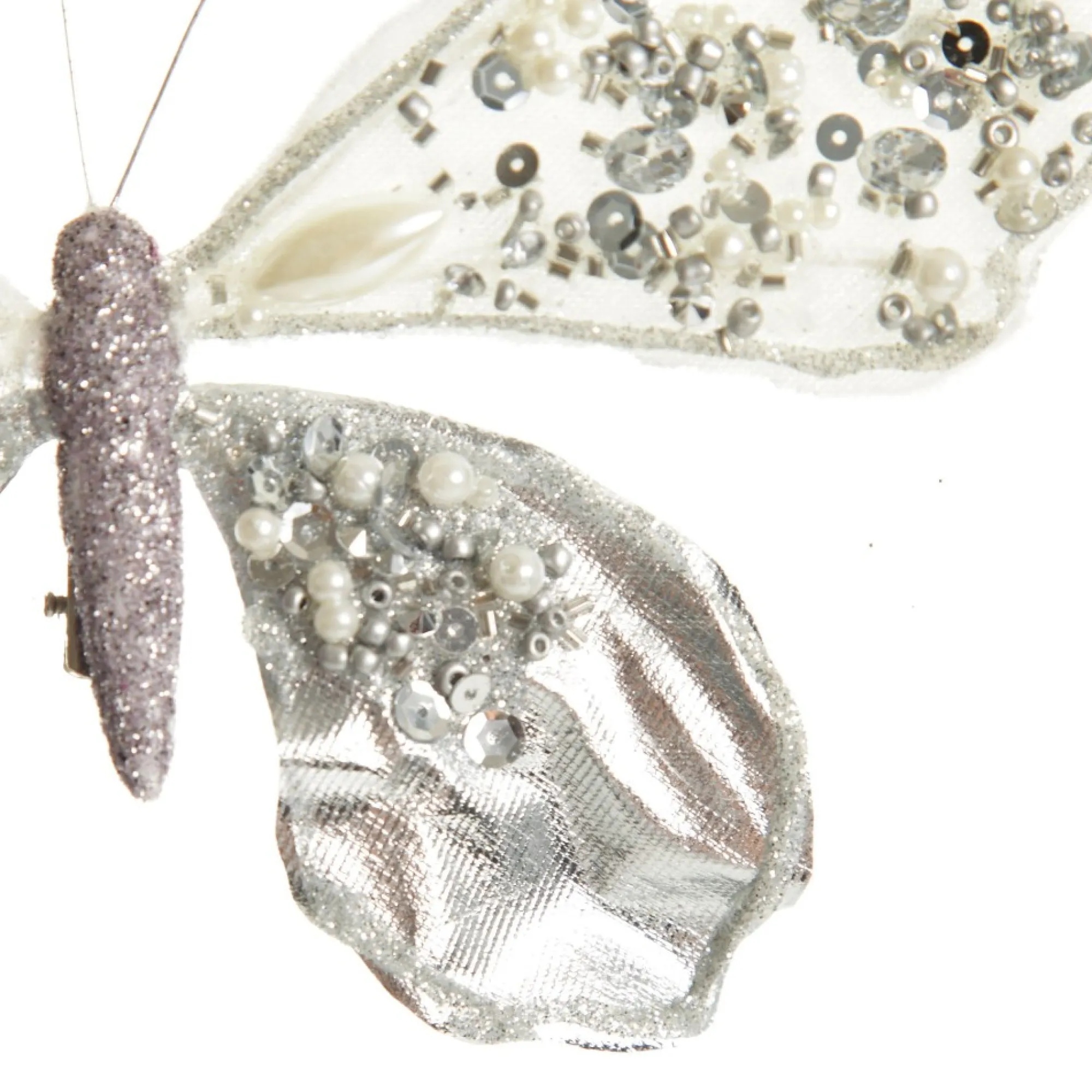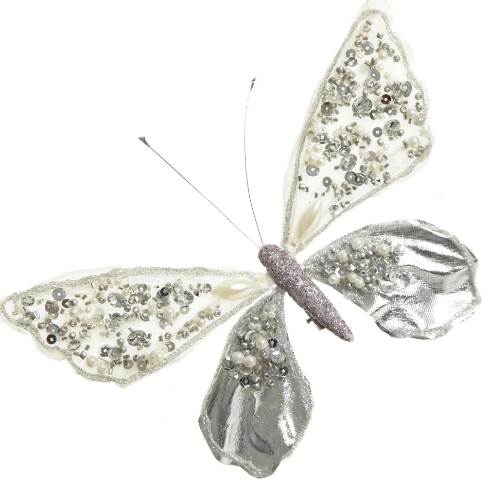 This Unique Shiny White And Silver Butterfly Clip With Sequin Embellishments Will Make An Excellent Addition To Your Festive Decor. Crafted From Lightweight Materials And A Combination Of Sheer And Metallic Fabrics With Sparkling Sequin, Bead, And Glitter Embellishments. A Clip Secured On The Back Of The Butterfly Makes It Easy To Secure And The Wired Wings Make For Easy Placement When Crafting And Decorating. Decorative Clips Can Be Used For Such A Wide Range Of Craft And Decor Purposes. Use Them To Add Exciting Embellishments To Your Christmas Tree, Garlands, Wreaths And More. It Can Even Be Used As A Unique Present Topper When Gift Wrapping Or As An Embellishment For Table Place Settings At Your Christmas Day Feasts. This Butterfly Clip Is Perfect For A Coastal Chic Christmas Decor Theme Paired With A Range Of Blue Tones, White Elements, Champagne Highlights, And Glitter Galore.