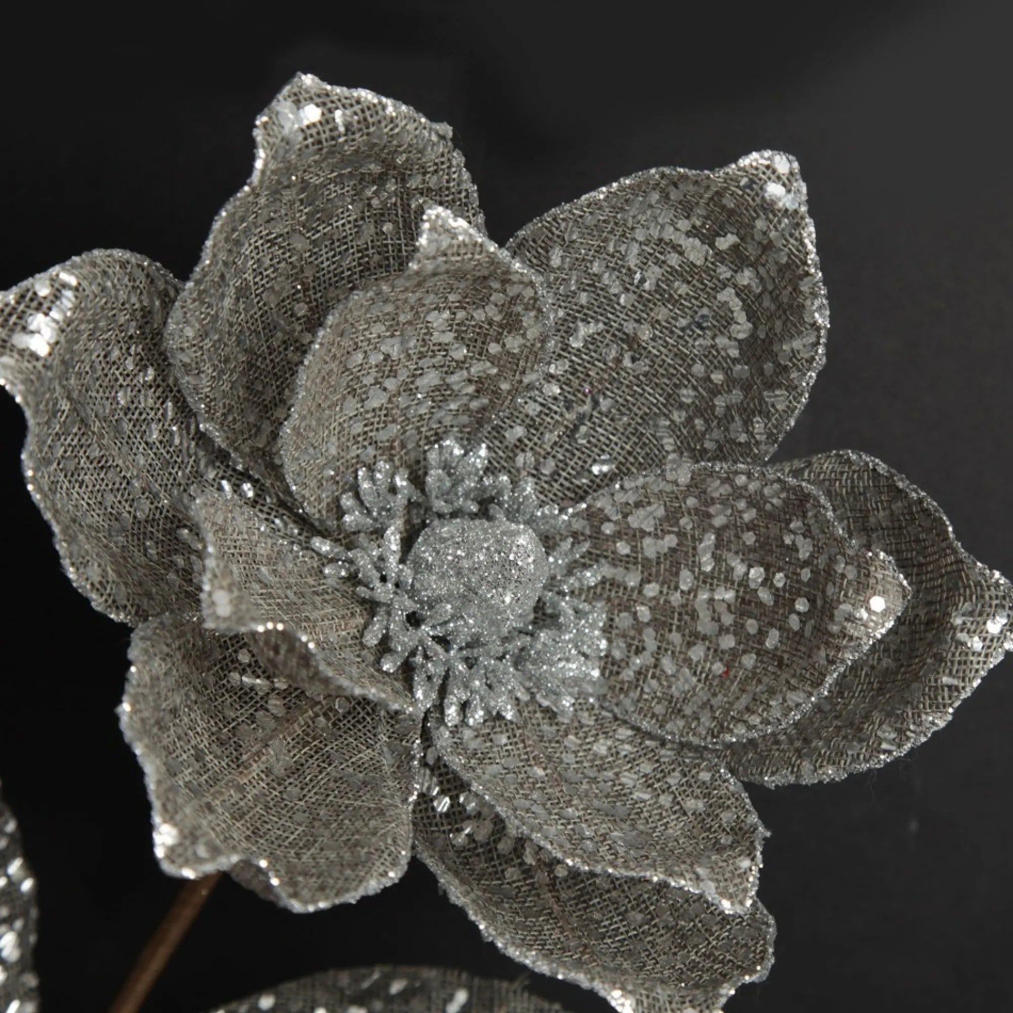 Create A Sparkling Christmas Display With Our Silver And Sequin Magnolia Flower Stem. Crafted From High-Quality Materials, This Faux Magnolia Flower Features A Collection Of Layered Petals Made From Mesh-Like Material With Stunning Silver Sequin Embellishments And Intricate Pollen Details In The Centre. Extending From The Base Of The Flower Is A Flexible And Durable Stem Adorned By Two Leaves With Sequin Details. Each Petal Is Wired To Allow For Easy Arranging As They Hold Shape. The Flexible Stem Can Be Used To Wrap Around Tree Branches Or Kept Straight To Be Placed In A Vase With Other Floral And Foliage Elements. Use To Embellish Your Christmas Tree, Garlands, And Wreaths Or To Create Your Own Unique Floral Arrangement In A Vase. Include Faux Flowers As A Staple In Your Decorating And Crafting Collection. Reuse Them Every Year To Create New And Exciting Arrangements. This Flower Would Suit A Unique Silver & Sage Christmas Decor Theme Perfectly. Pair With Sleek Silver And Soothing Sage Tones To Create An Elegant And Delightful Display.