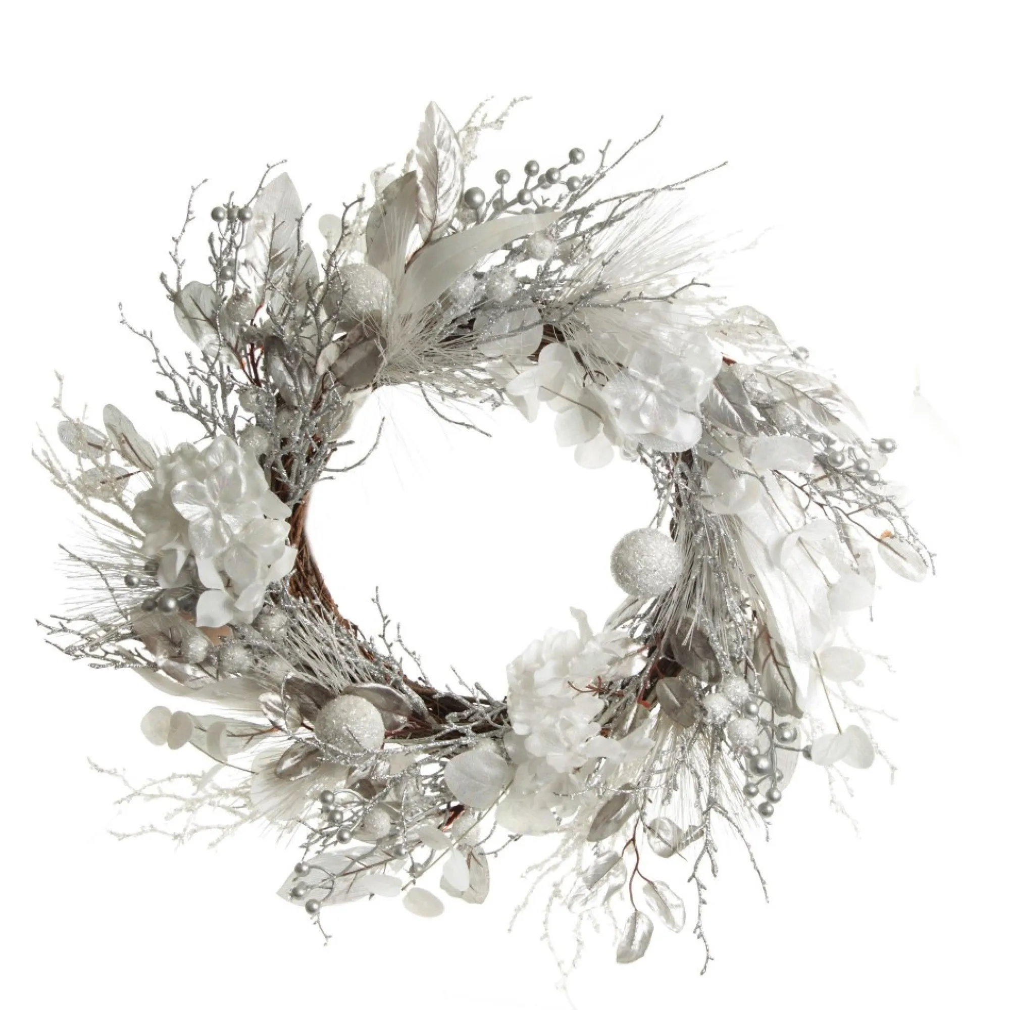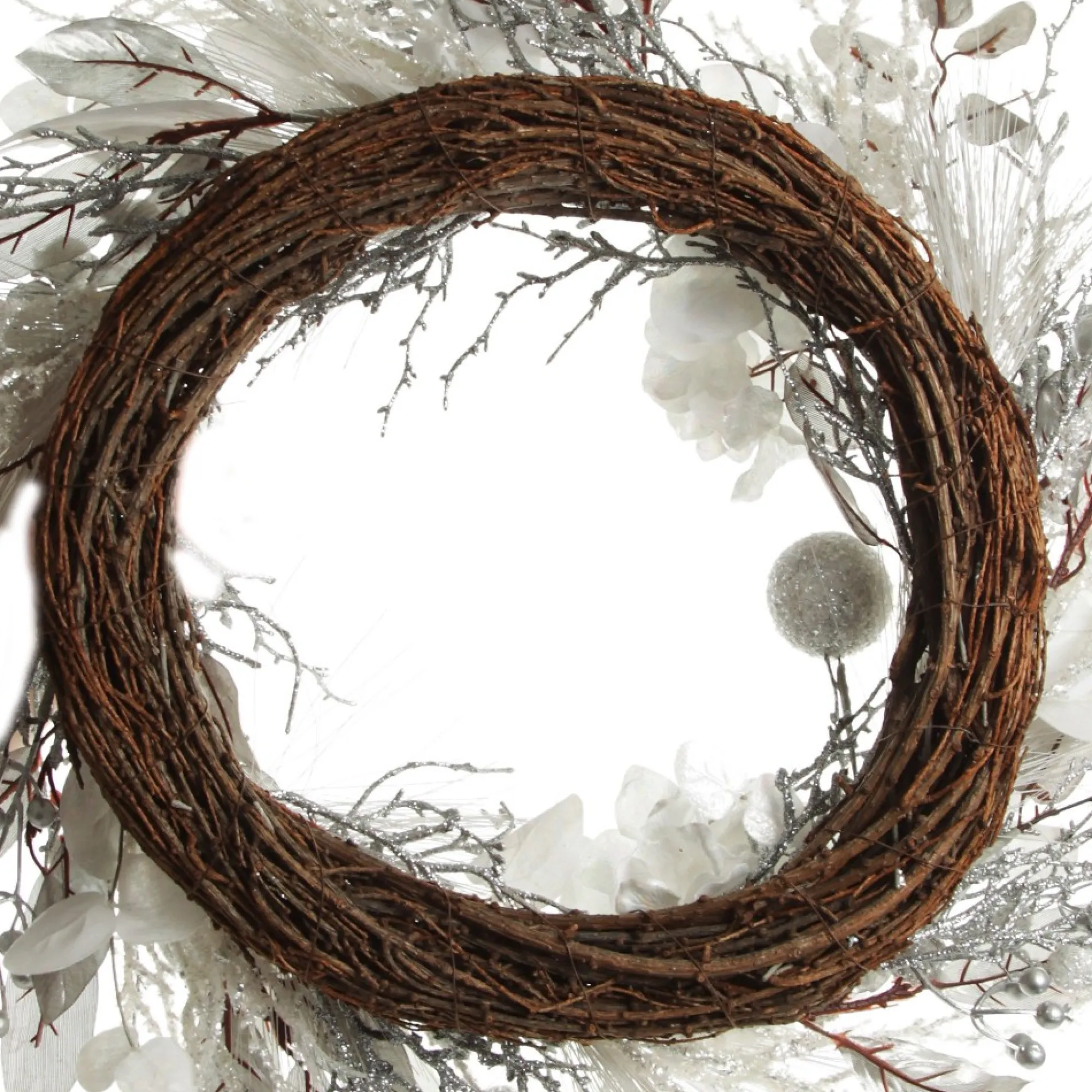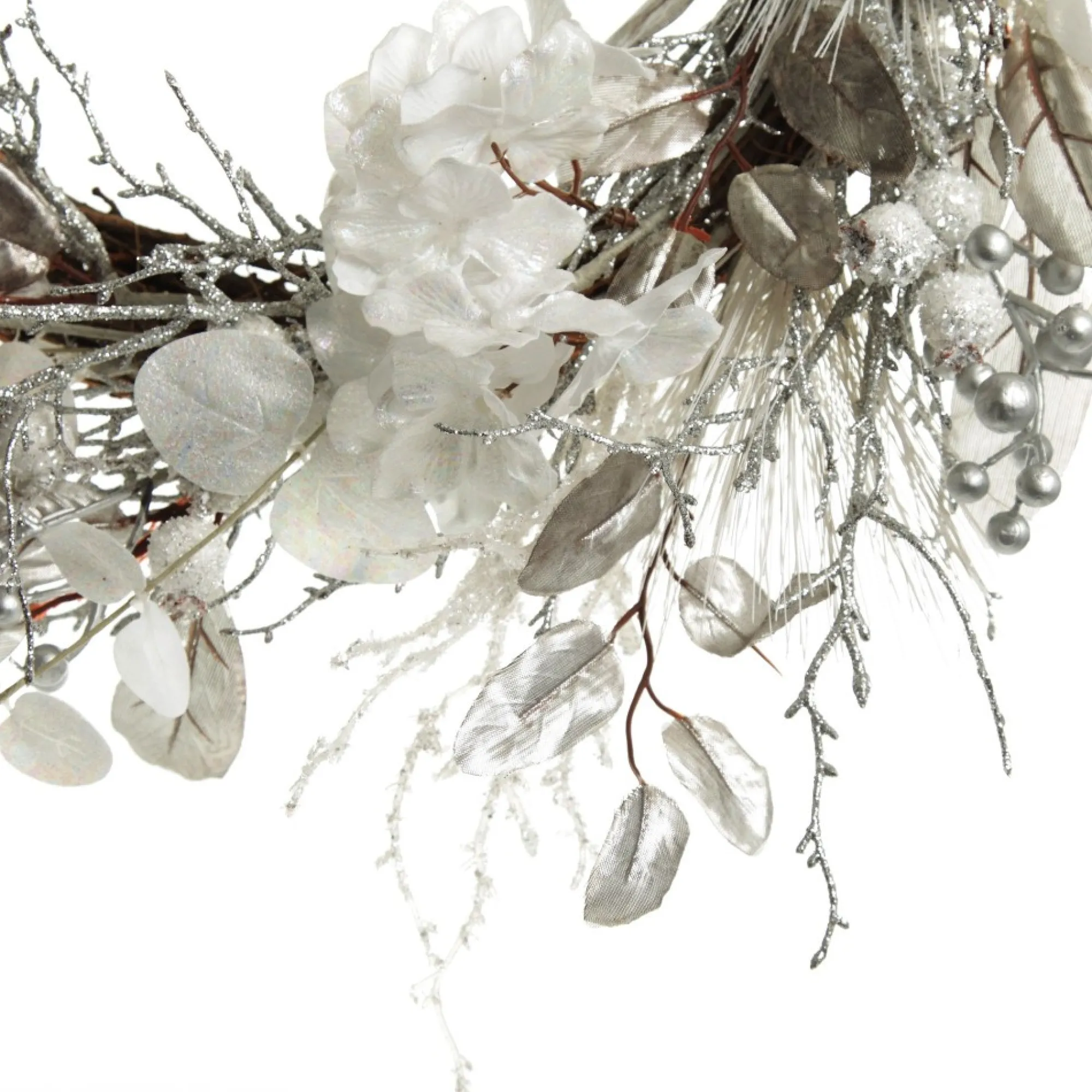 Crafted With A Twig-Like Base For Easy Hanging, This Wreath Features Stunning White And Silver Foliage With A Lush Assortment Of Flowers, Leaves, Twigs, And Berries In Glitter Finishes. The Collection Of Different Foliage Creates A Textured And Sparkling Display Which Is Sure To Impress.