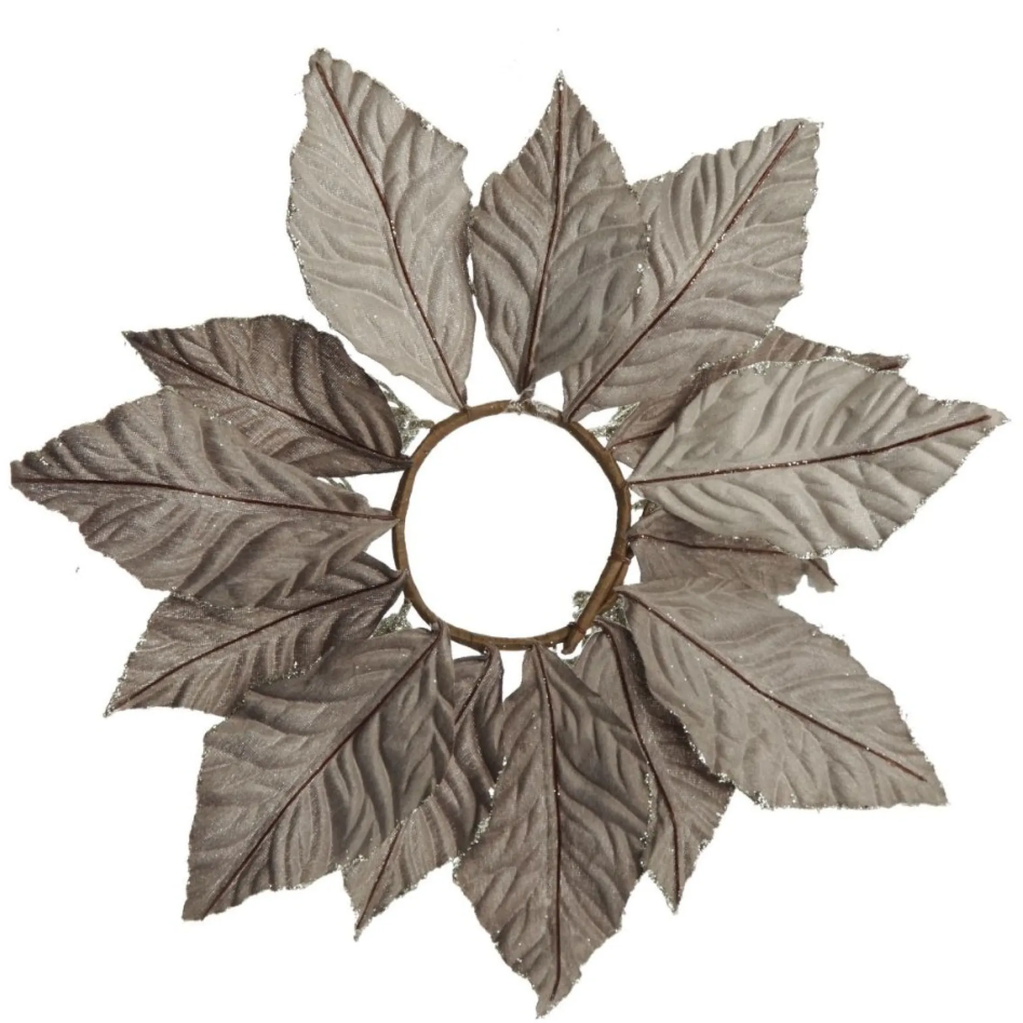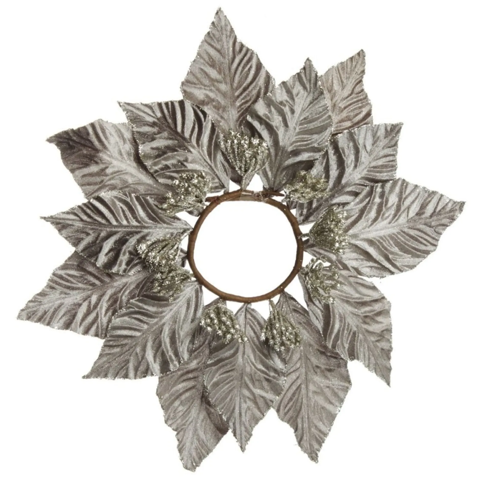 Transform Your Mantle Or Table Arrangment Into A Christmas Masterpiece With This Silver Velour Poinsettia Candle Wreath. Measuring At 40Cm In Diameter And Crafted From Velour Leaves With Glitter Edging And Clusters Of Glittery Berries, It Is Sure To Be A Stand Out Piece Of Christmas Decor.