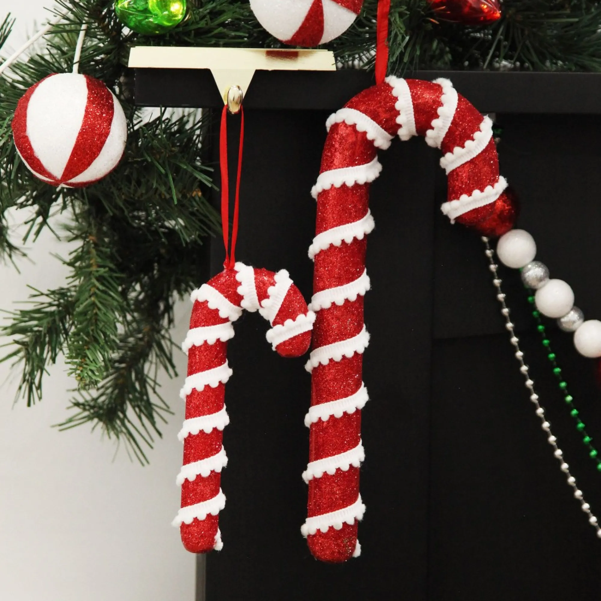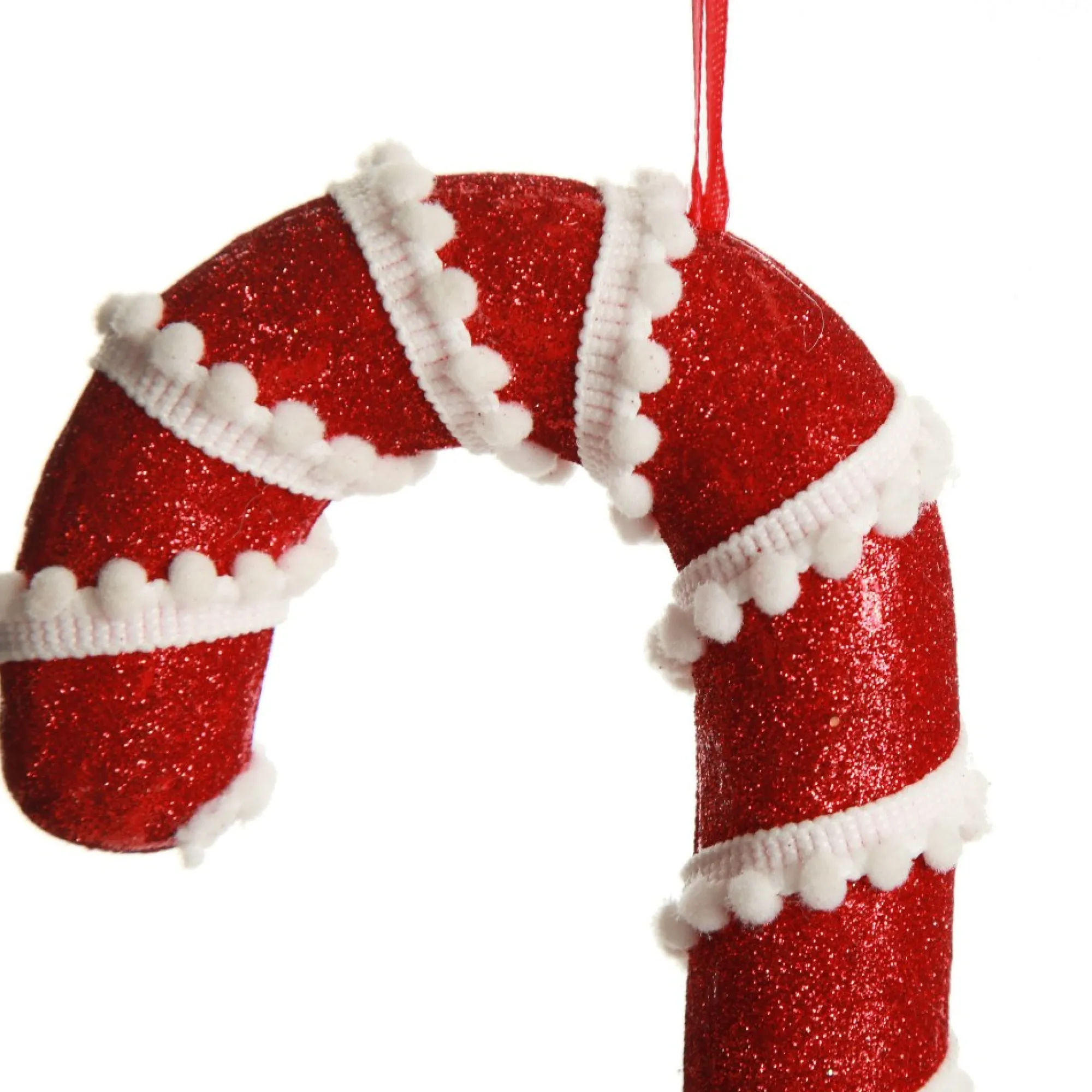 Available In Medium Red Glitter With Braid And Twine Candy Cane Christmas Decoration, And Medium Red And White Glitter With Braid And Twine Candy Cane Christmas Decoration.