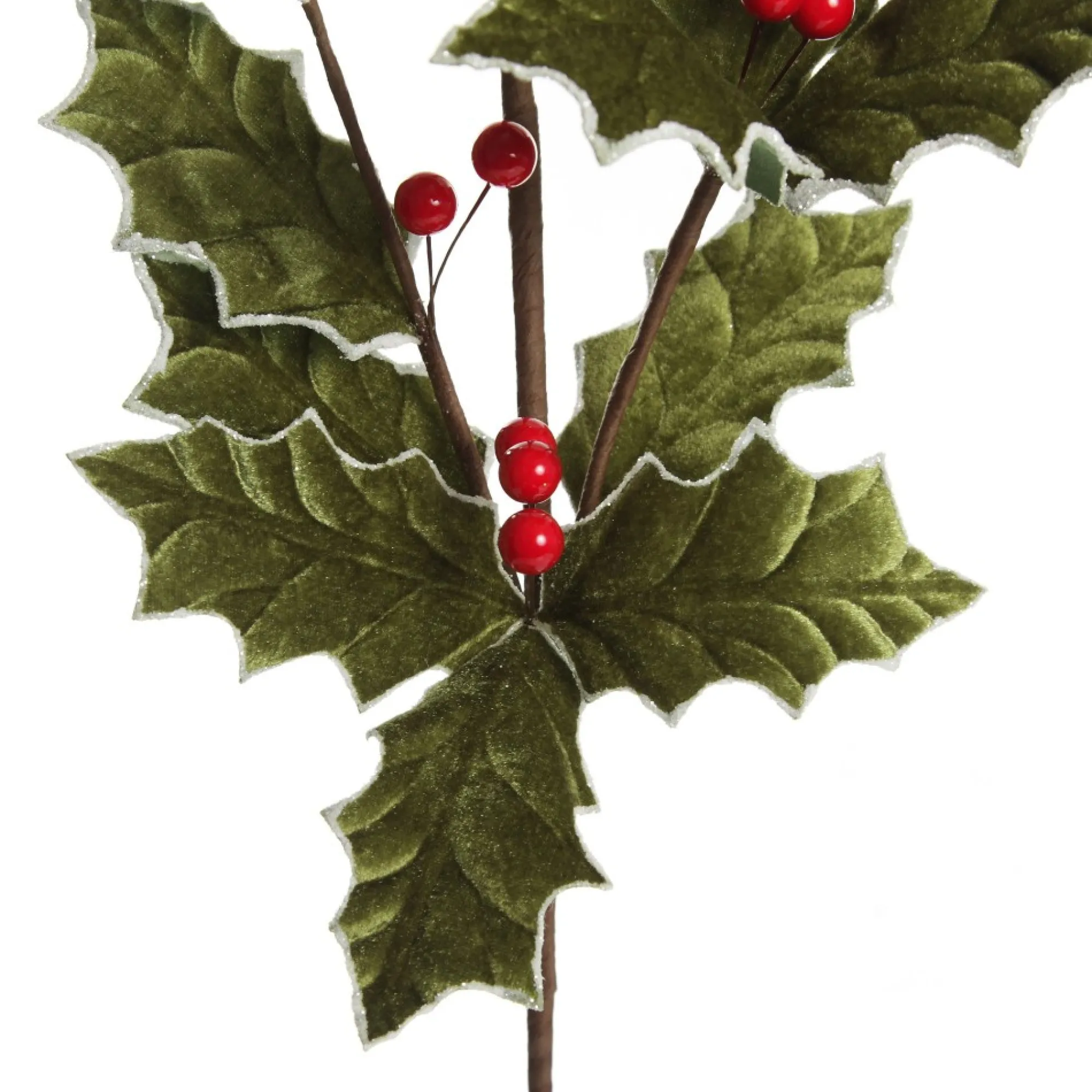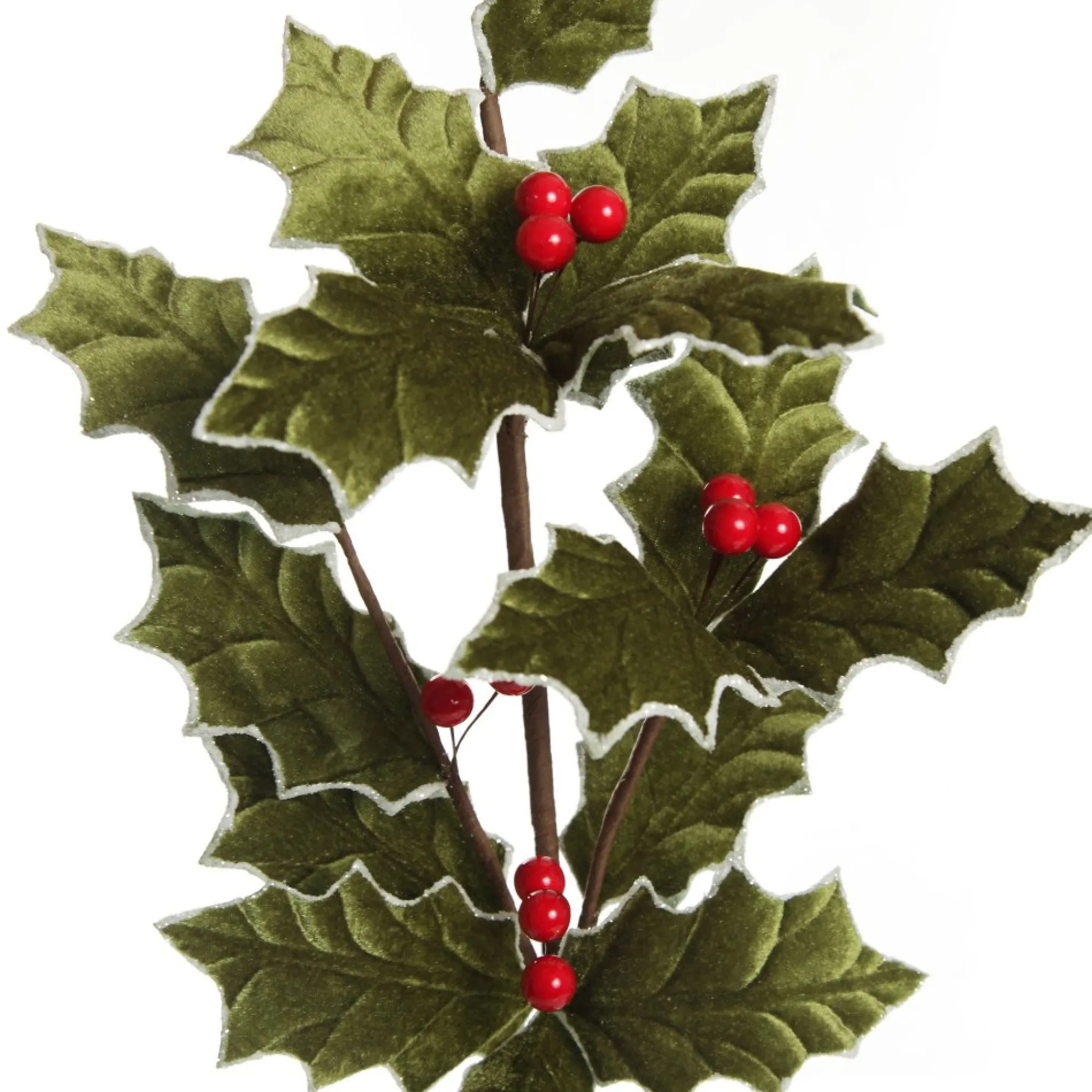 Bring Timeless Festive Charm To Your Home With This Traditional Green Velvet Holly Leaf Christmas Spray With Red Berries. Featuring A Collection Of Textured Holly Leaves Crafted From Velour With White Glitter Trim. Small Red Berries Also Adorn The Spray. The Durable And Flexible Stem Makes It Easy To Place And Arrange As Needed When Decorating.
