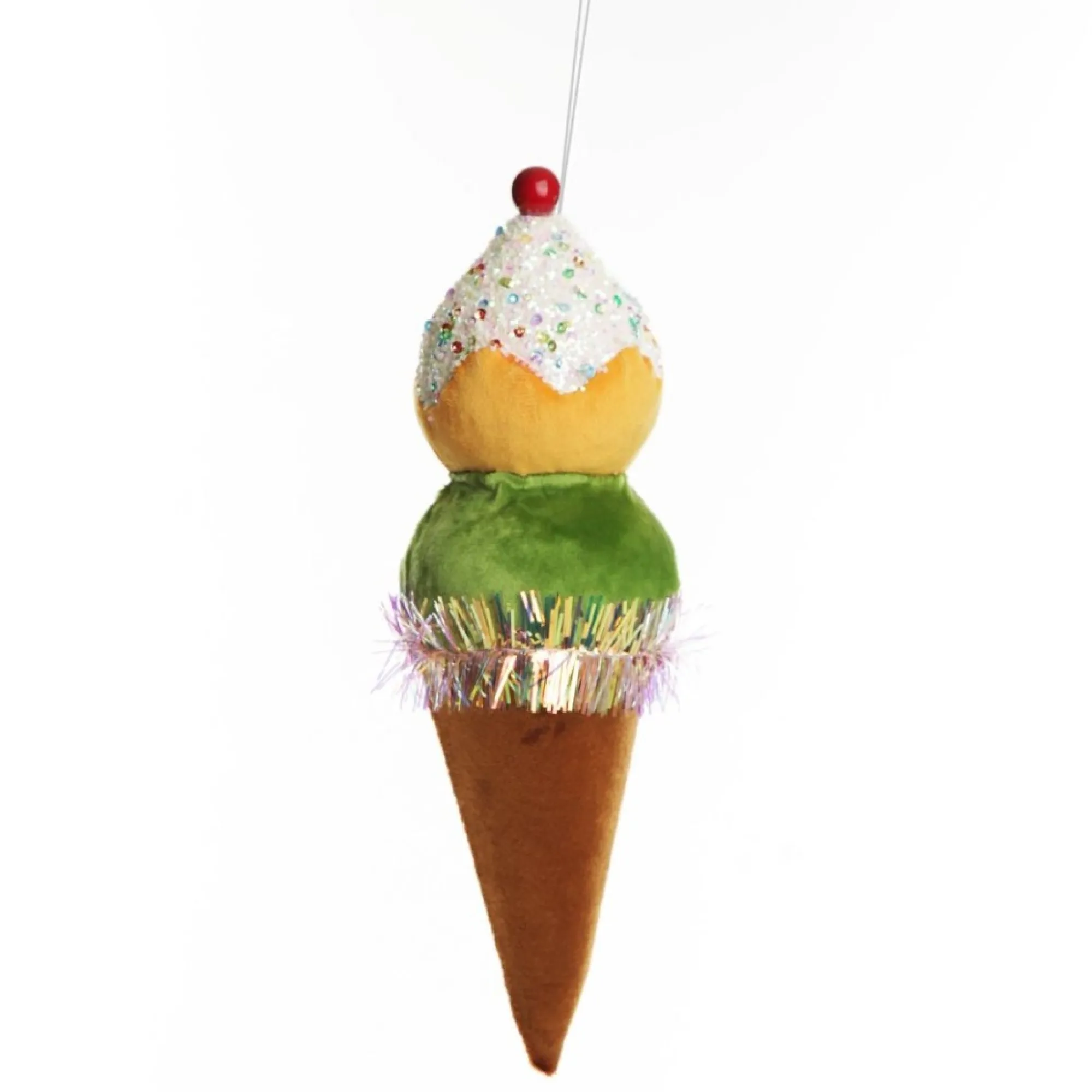 Crafted From Lightweight Base Material And Finished In Soft Velvet, This Ice Cream Cone Decoration Features Two Colourful Scoops And Is Topped Off With Exciting Glitter, Sequin, And Tinsel Details. The Decoration Comes With A String, Ready To Hang Straight On Your Tree.